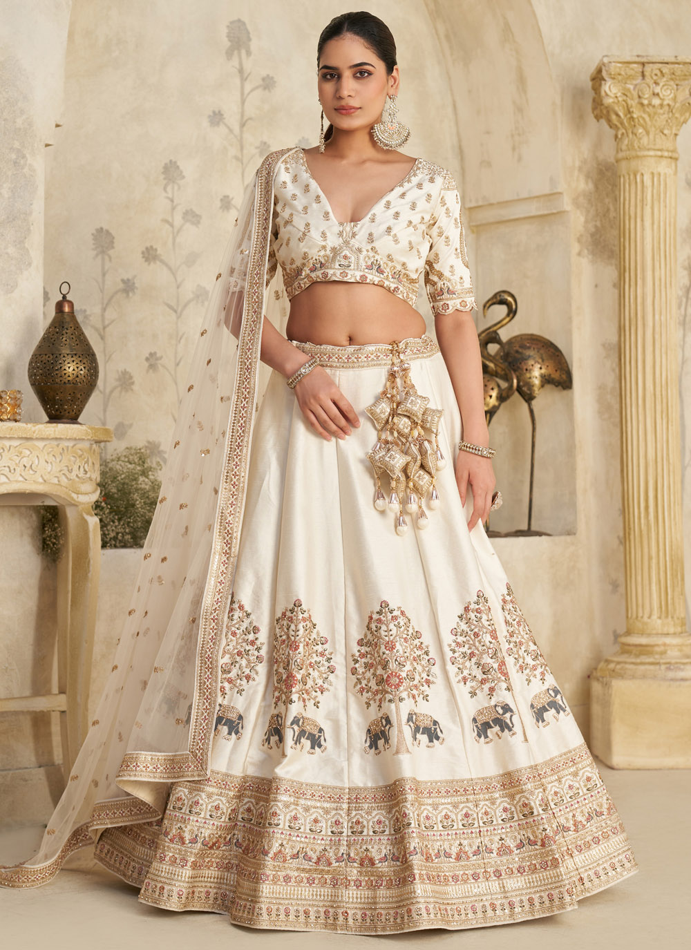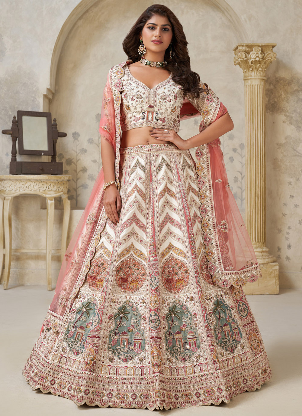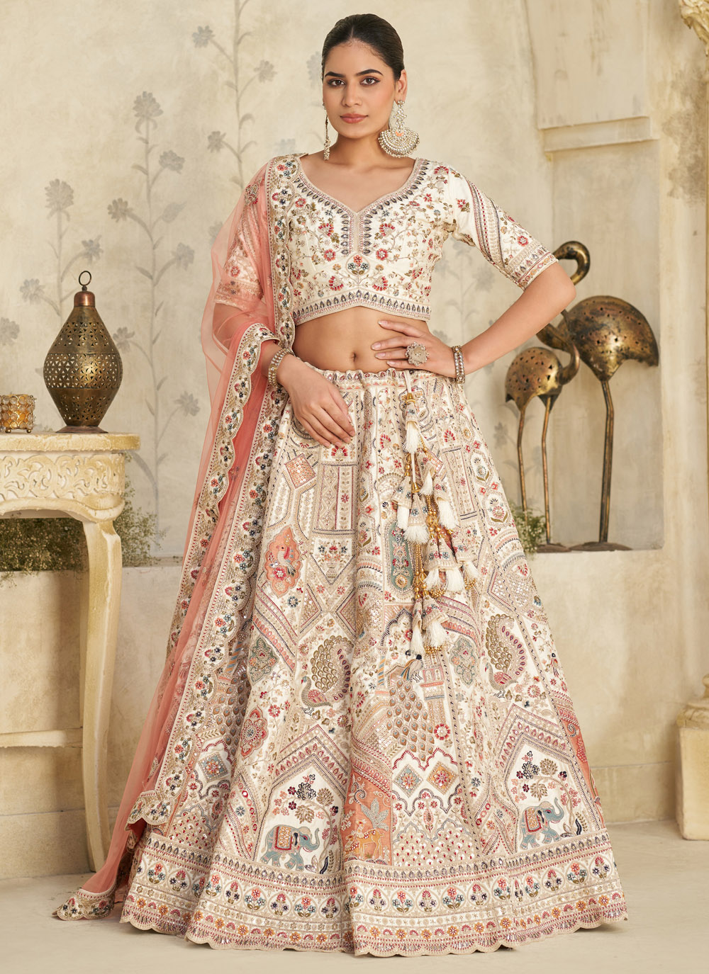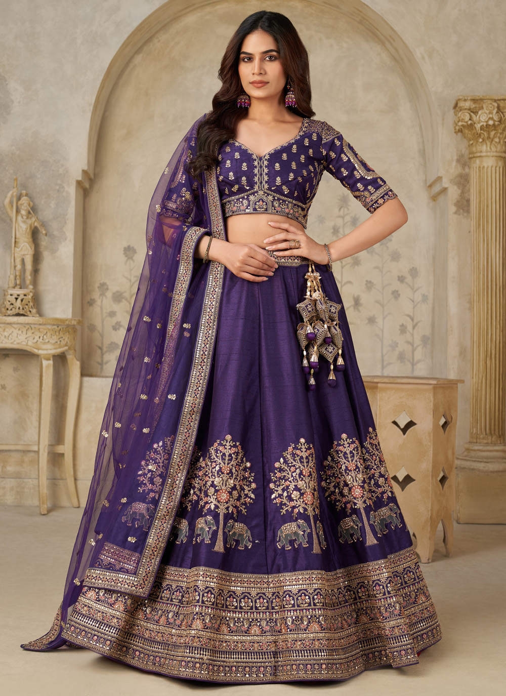 This designer rust silk lehenga choli offers a beautiful mix of classic embroidery and contemporary flair. The sequins and stone work enhance the zari detailing, giving you a graceful reception look that stands out effortlessly. Comes with matching choli and dupatta.