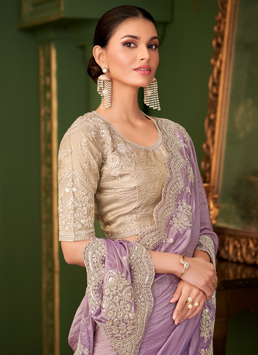 This lavender satin georgette saree offers a calm and elegant appeal. The embroidery adds refined detailing that elevates its overall beauty. The fabric falls gently and flatters every figure, making it suitable for long celebrations. Comes with matching blouse.