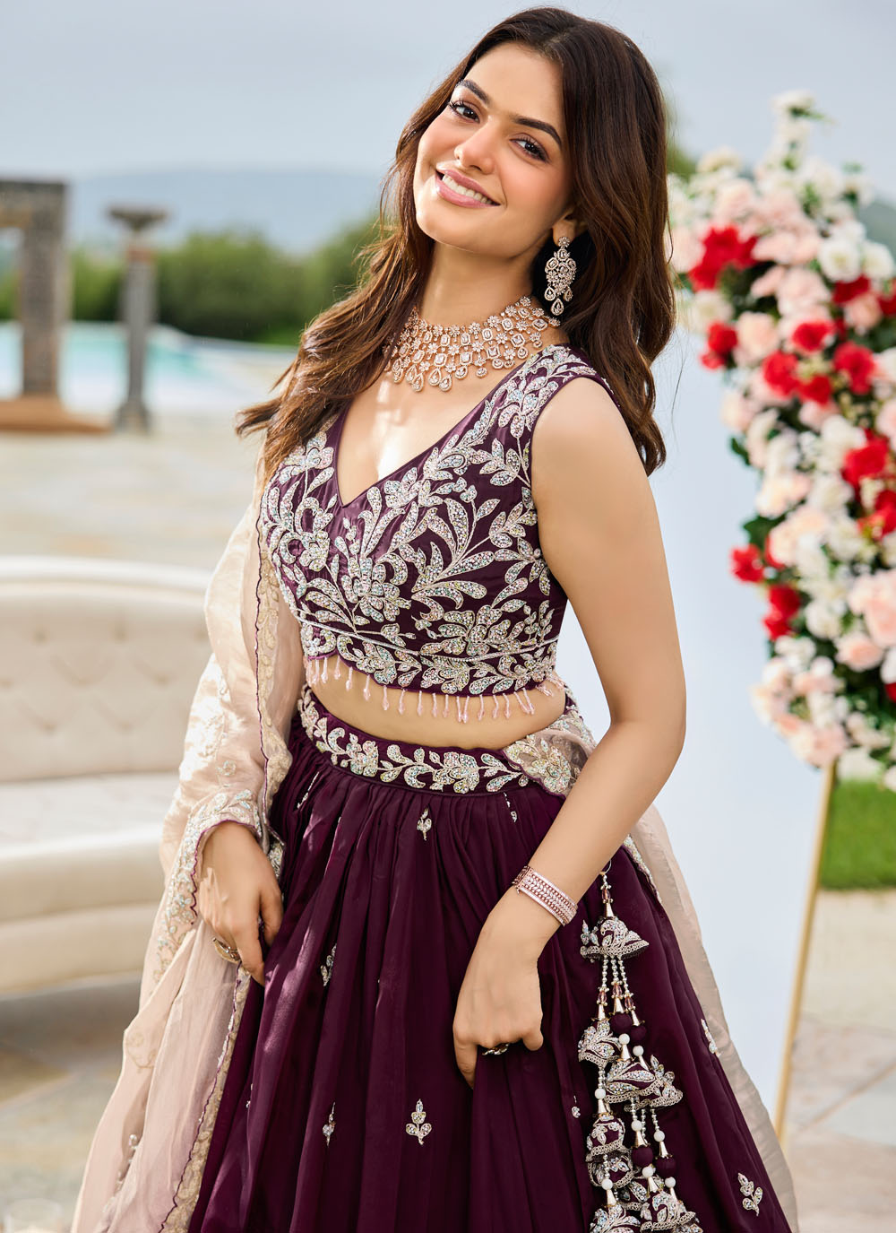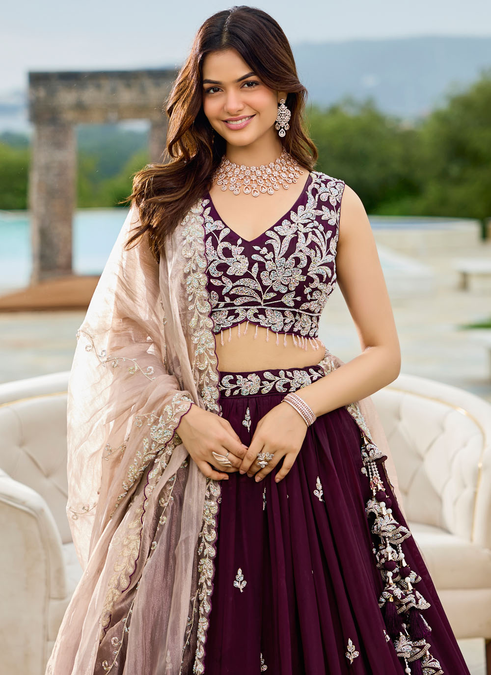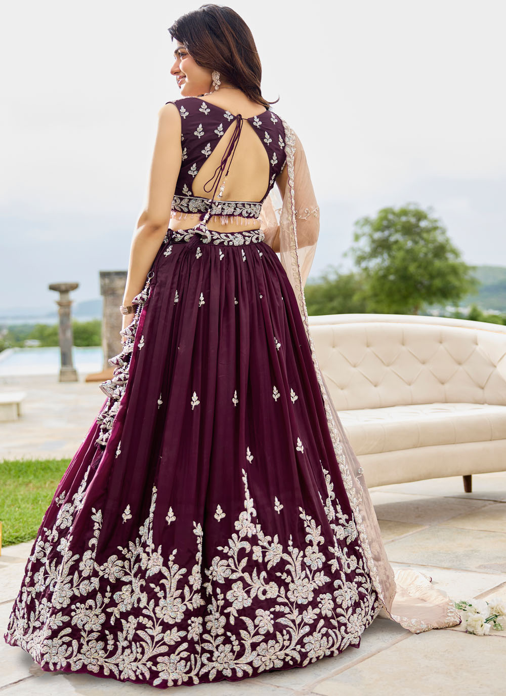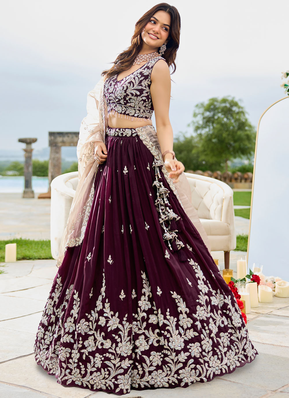 Dazzle on your special day with this Wine Satin Silk Readymade Lehenga Choli, adorned with sequins, thread, and bead embroidery. Its deep wine shade and intricate handwork make it a glamorous choice for engagements and receptions. Comes with matching choli and dupatta.
