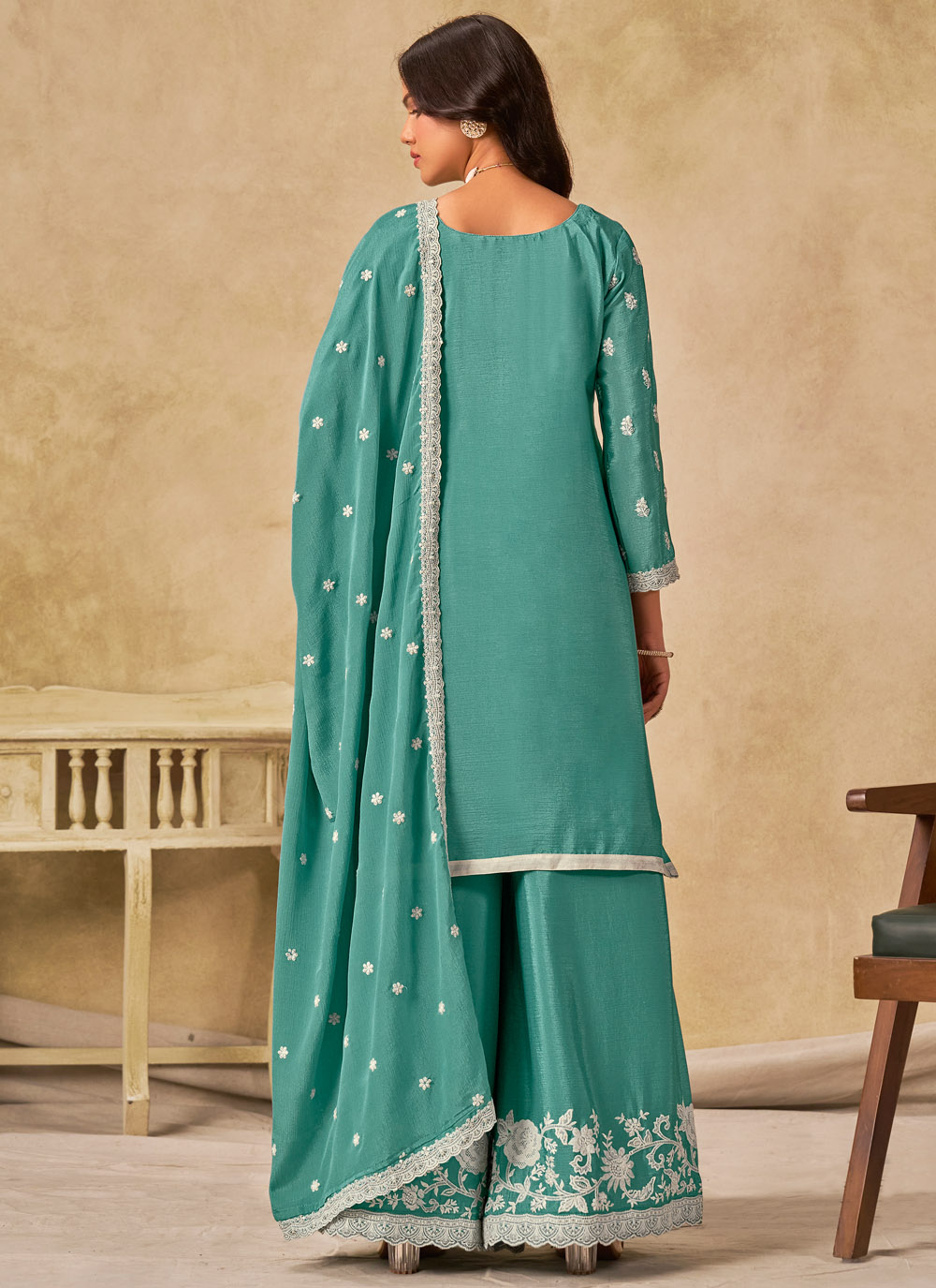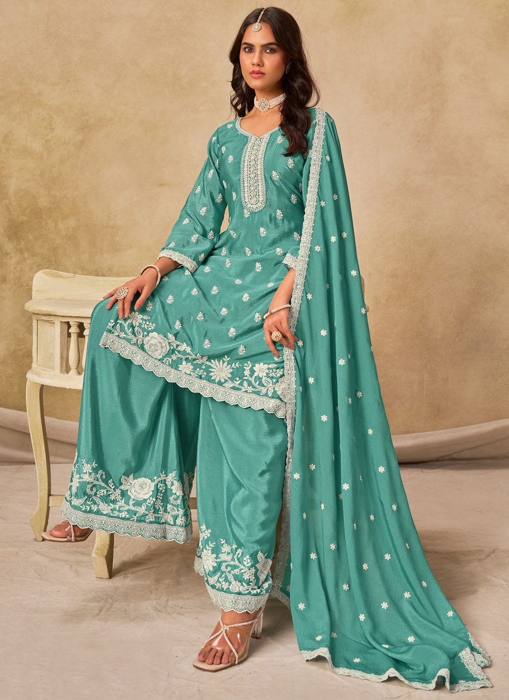 This embroidered palazzo salwar kameez in sea green chinon brings together style and elegance. The soothing shade combined with fine embroidery work makes it a refined choice for ceremonial functions or evening gatherings. Comes with matching bottom and dupatta.
