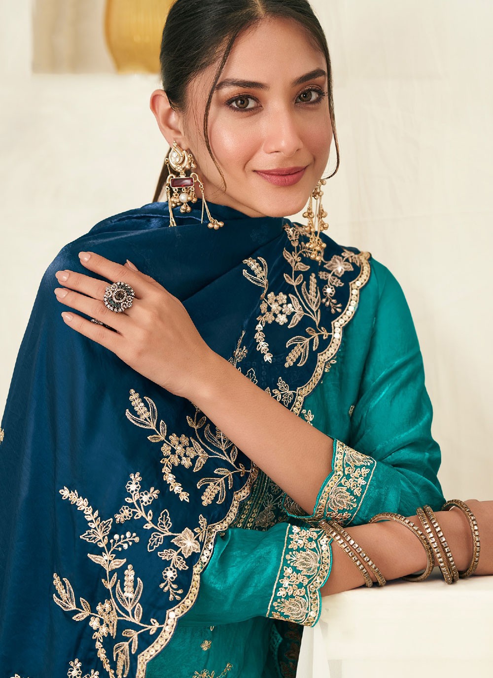 Elevate your ethnic wardrobe with this sea green palazzo salwar suit. The refined embroidery work adds sophistication, while the readymade silhouette ensures a perfect blend of style and ease. Comes with matching bottom and dupatta.