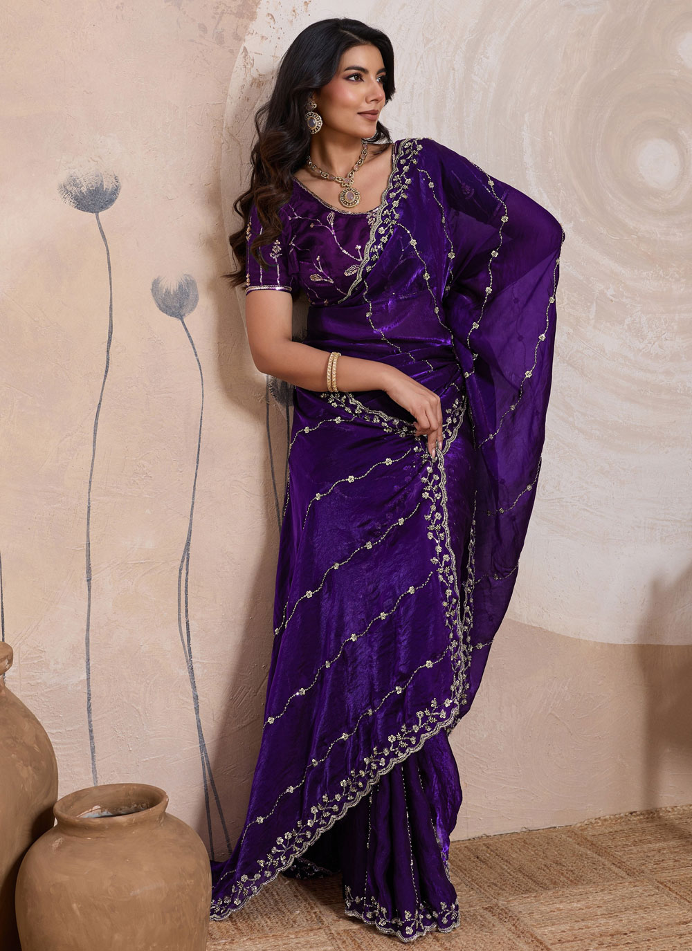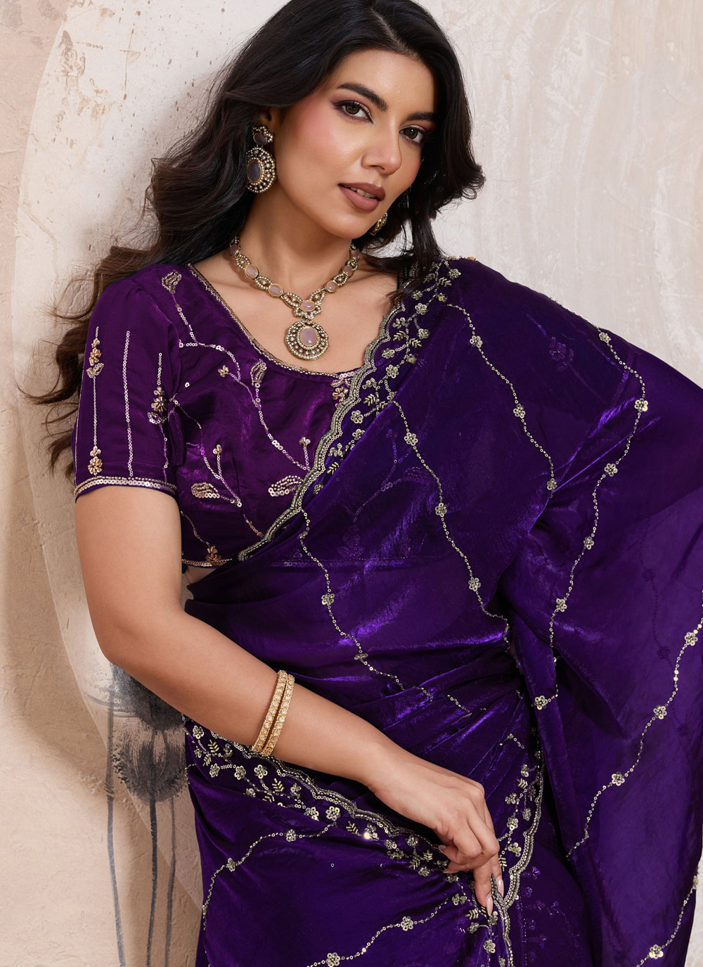 This Purple Satin Velvet Embroidered Saree blends traditional artistry with modern sophistication. Detailed with sequins, beads, zari, and cut dana work, it creates a refined and festive appearance. Comes with matching blouse.