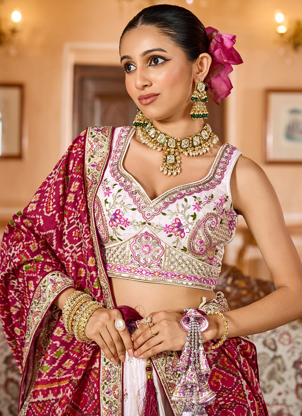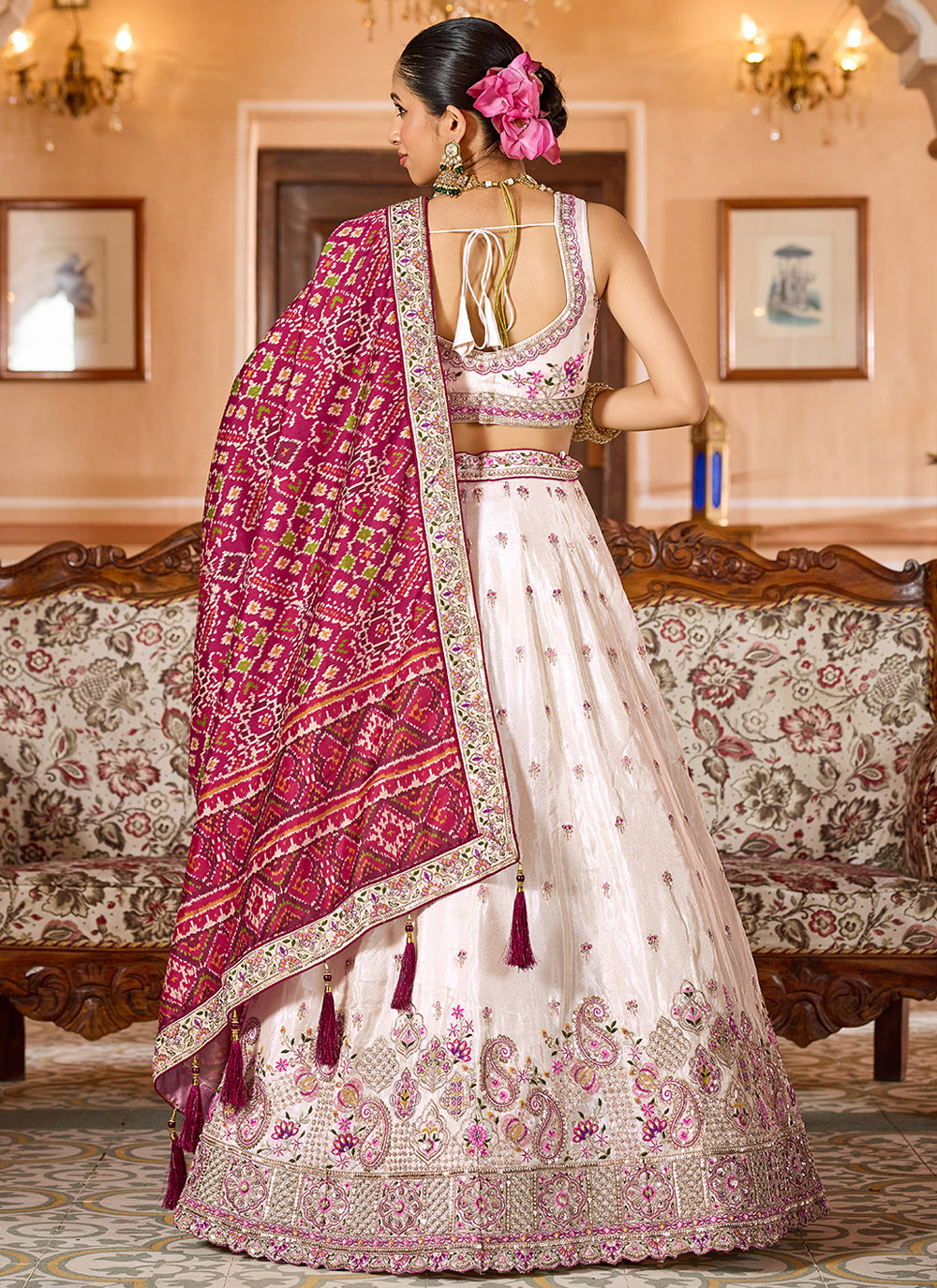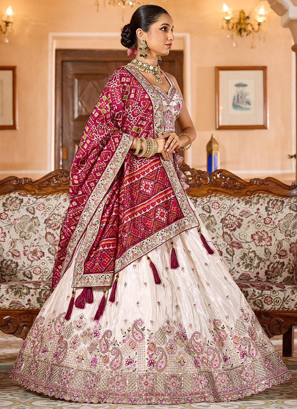 This trendy cream tissue lehenga choli blends modern aesthetics with traditional embroidery. The sequins work highlights the ethnic patterns, adding a subtle glow to the attire. Comes with matching choli and dupatta.