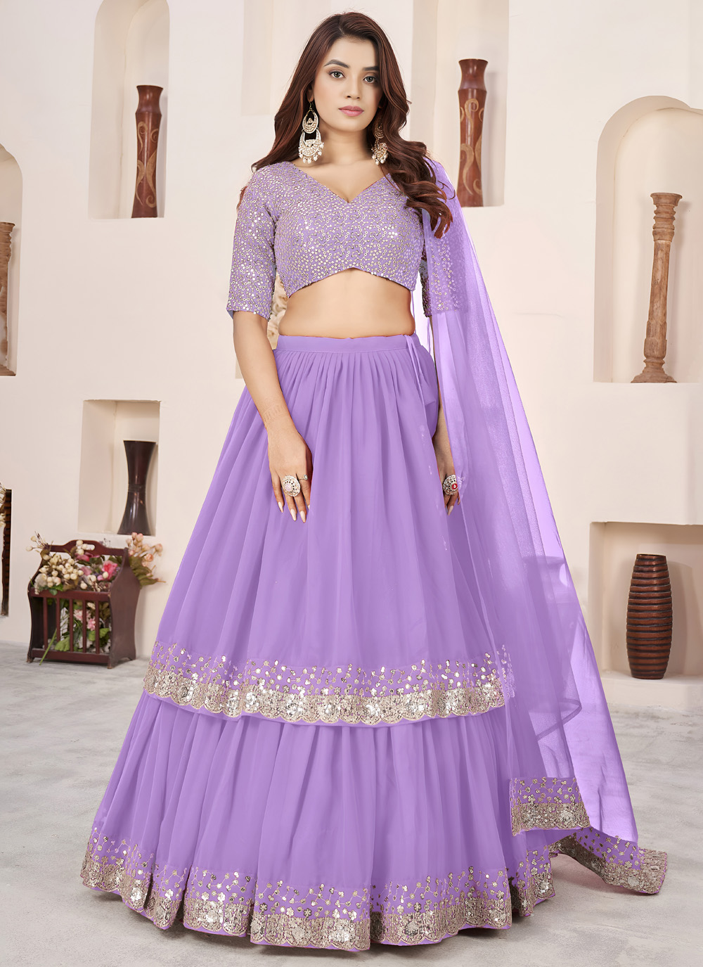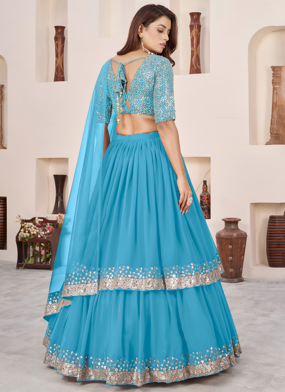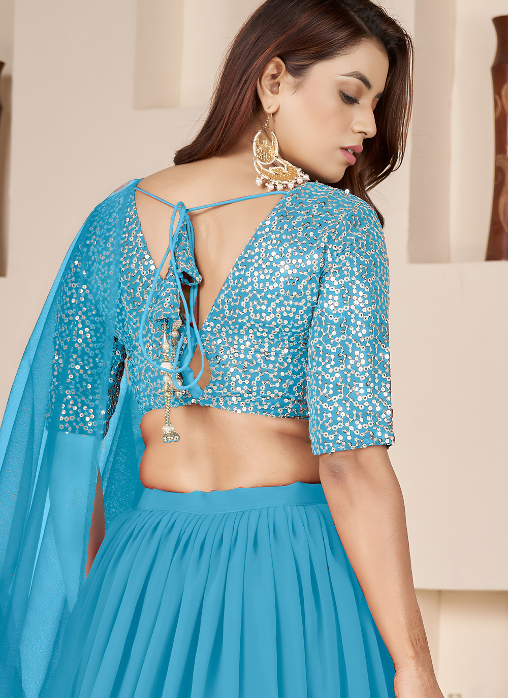 This trendy aqua blue georgette lehenga choli showcases refined craftsmanship with shimmering sequins and zari embroidery. Its modern appeal and comfortable fabric make it suitable for festive and ceremonial wear. Comes with matching choli and dupatta.