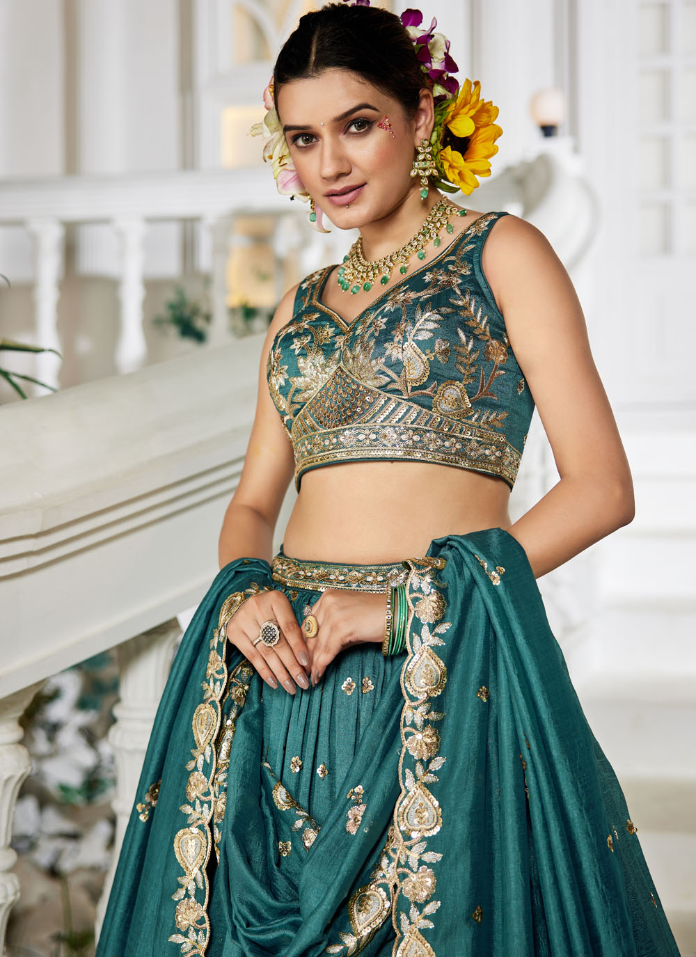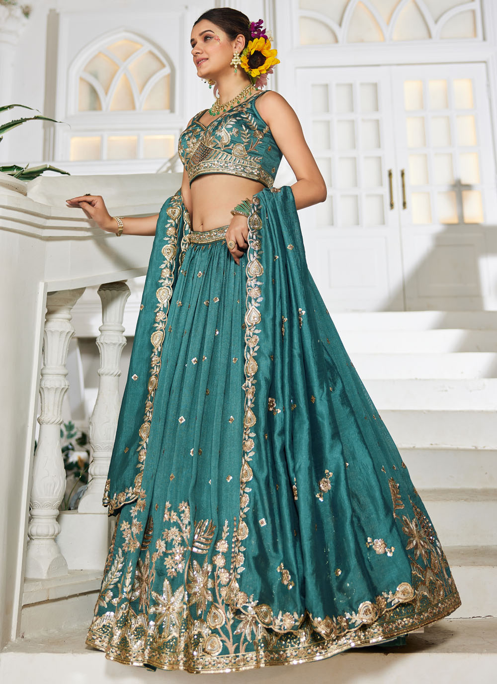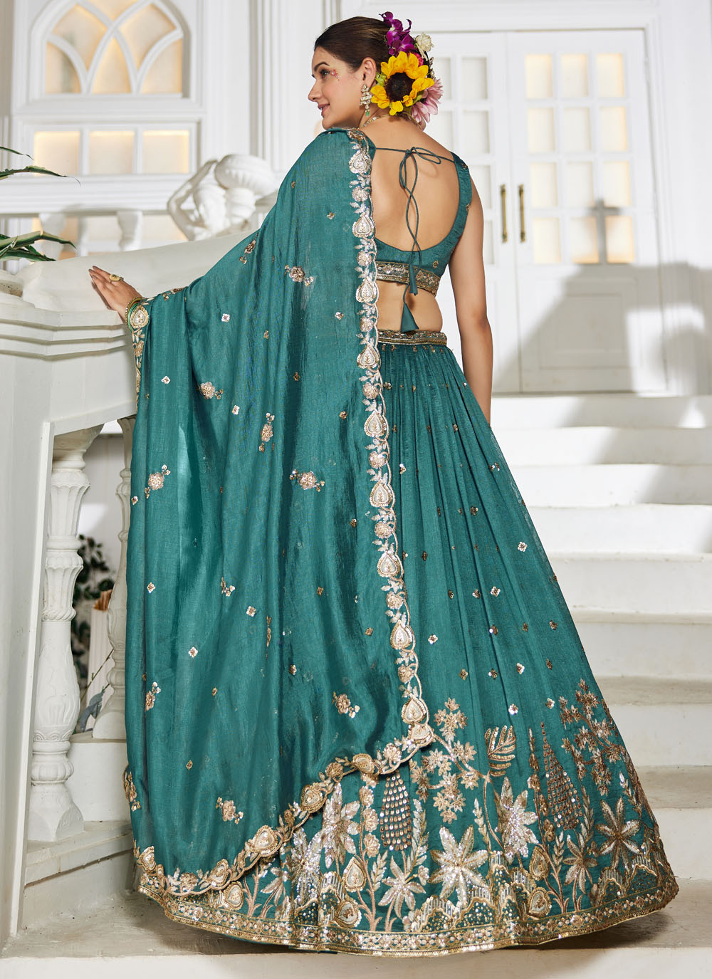 Make your festive appearance unforgettable with this teal georgette lehenga choli, designed with shimmering sequins and delicate thread work. Its flared silhouette and fine detailing offer a graceful touch for weddings and parties. Comes with matching choli and dupatta.