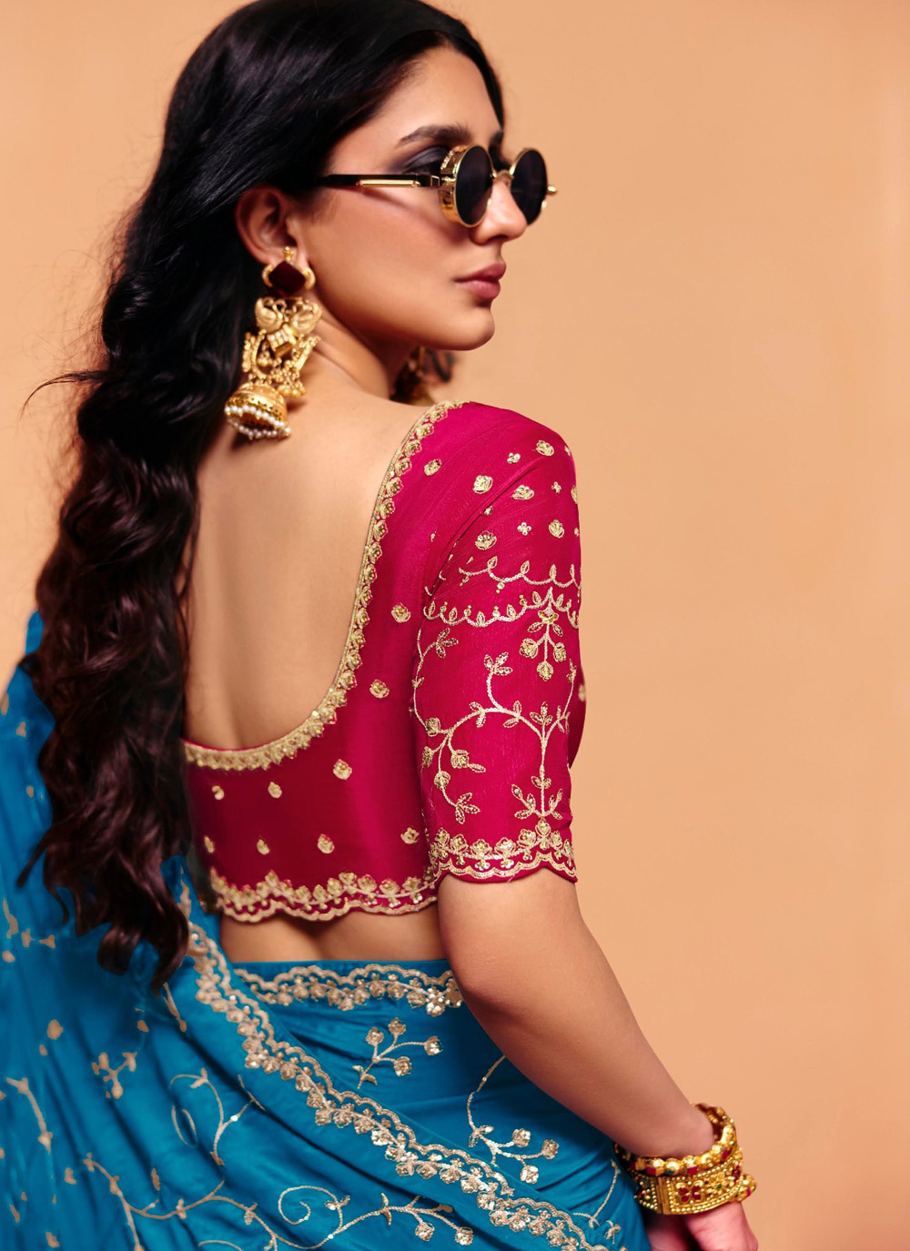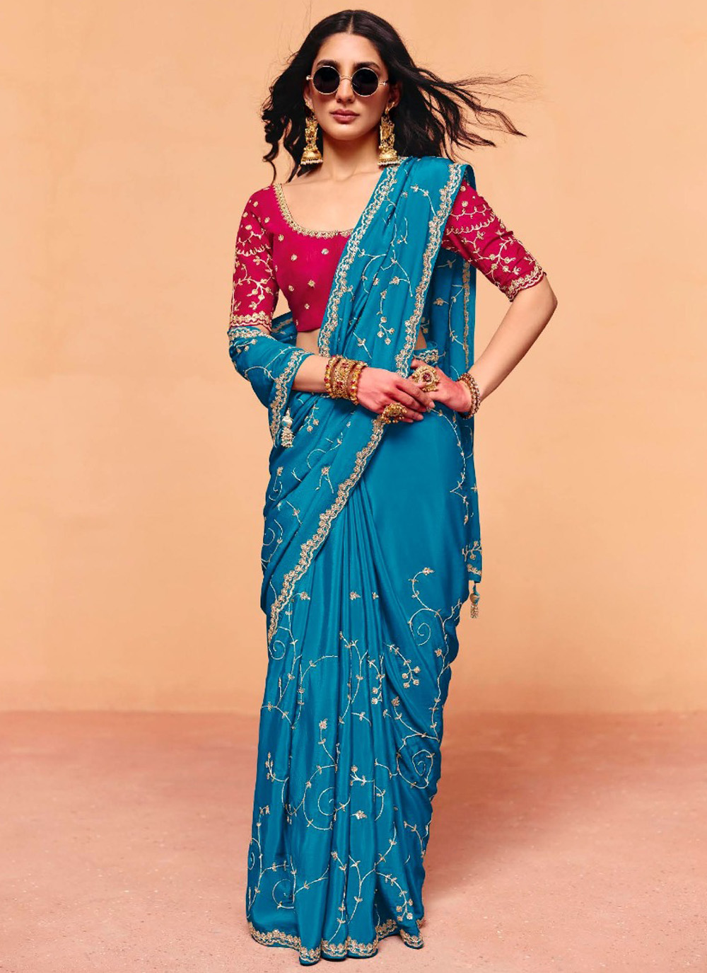 This Embroidered Sequins Work Aqua Blue Satin Silk Traditional Saree blends traditional design with modern elegance. The vibrant aqua blue tone and shimmering sequins embroidery create a rich and stylish look. Comes with matching blouse.