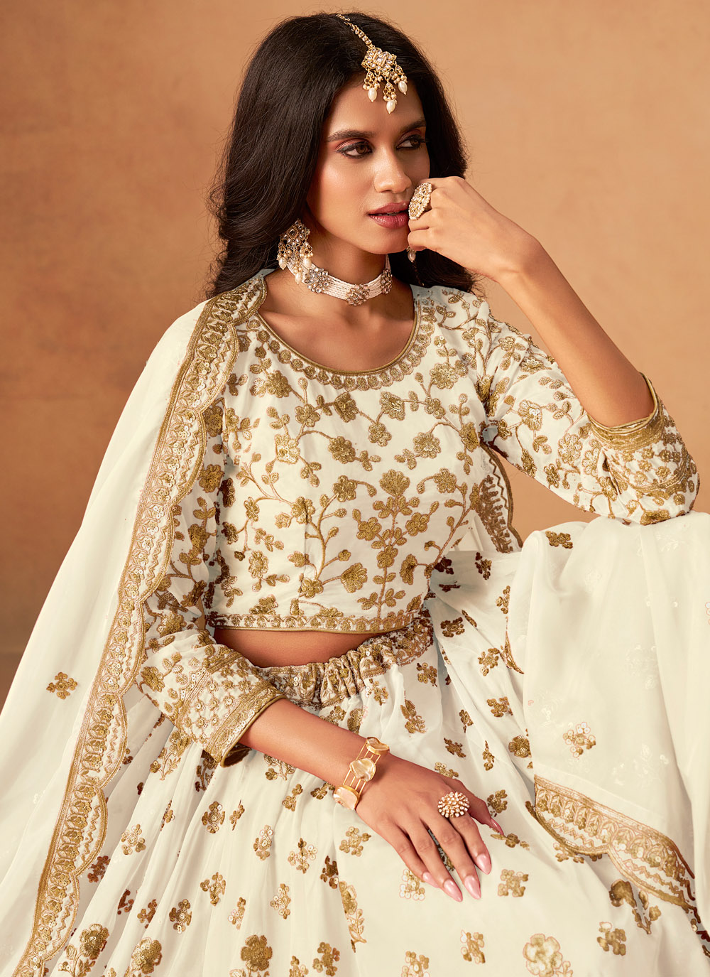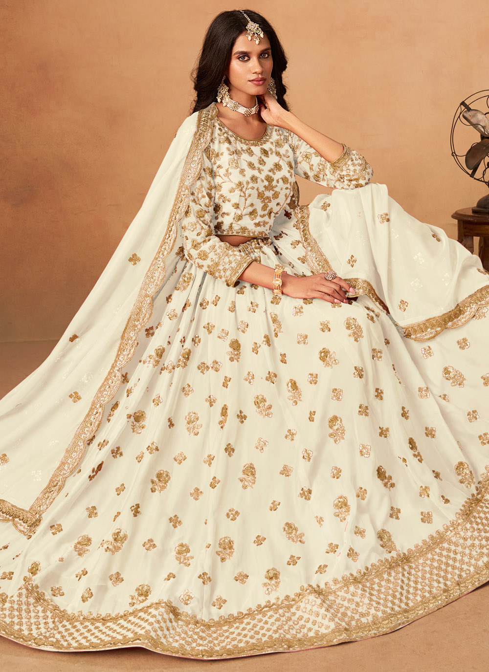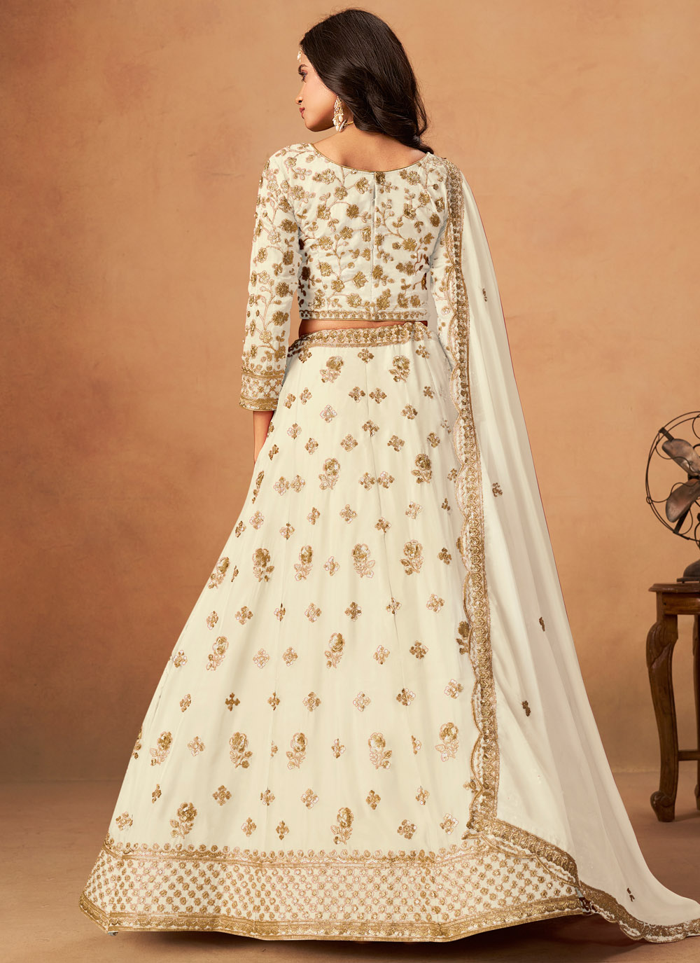 Crafted in organza fabric, this Off White Lehenga Choli is styled with embroidered sequins work for a refined look. Suitable for festive gatherings, family functions and bridal celebrations. Comes with matching choli and dupatta.