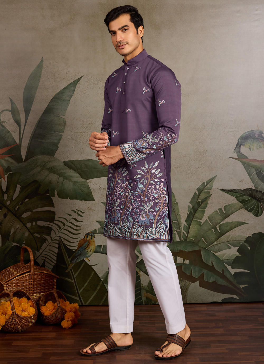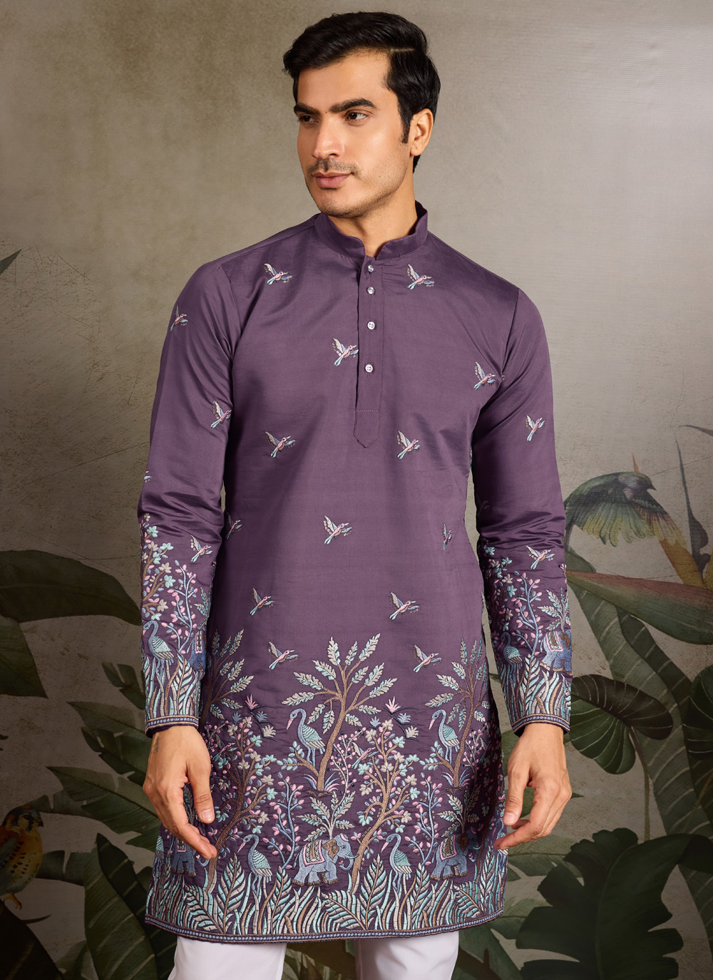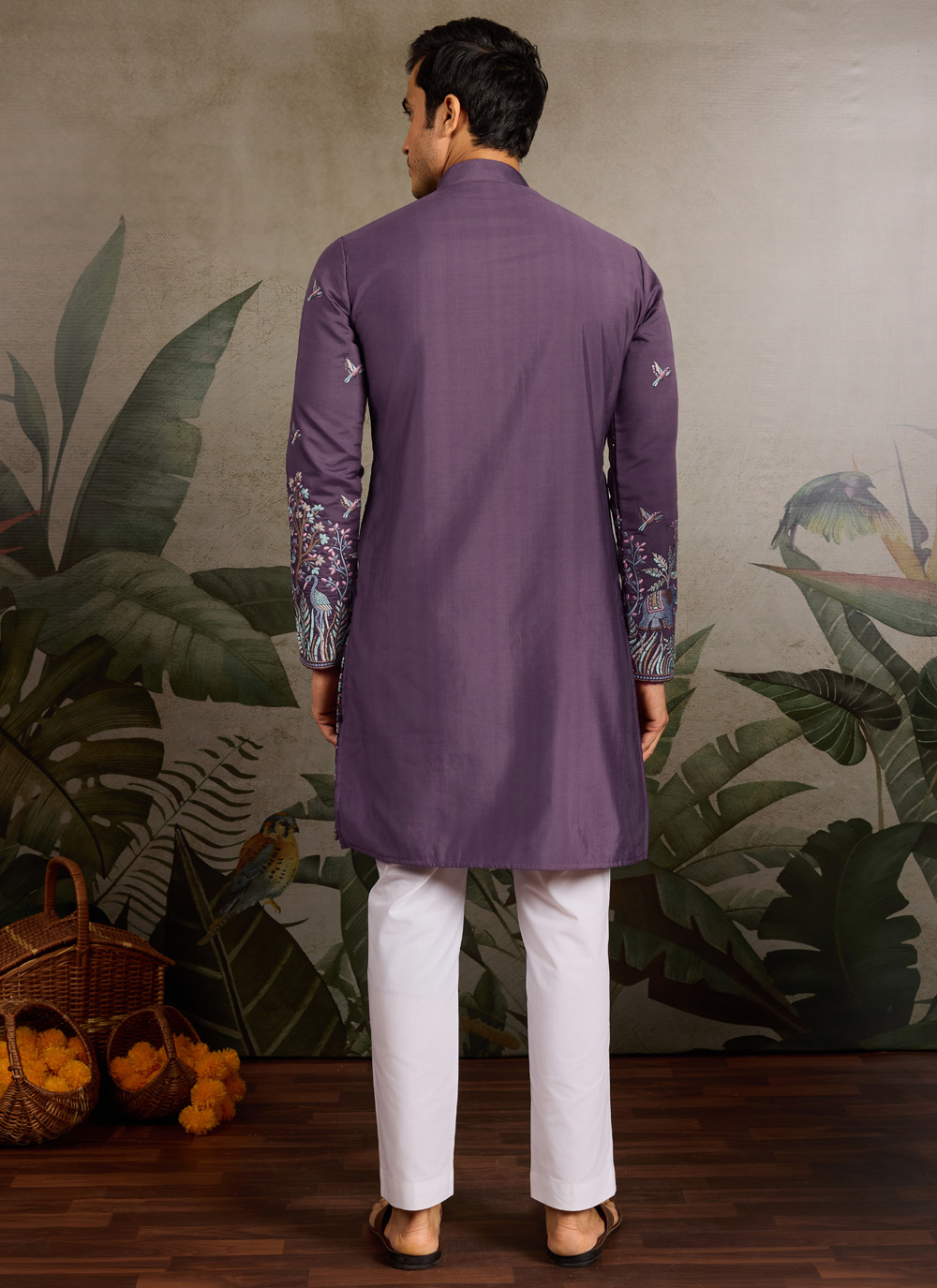 Turn heads with this purple viscose silk kurta adorned with intricate thread embroidery and shimmering sequins. Its contemporary cut and vibrant hue make it a must-have for weddings, engagements or festive parties.