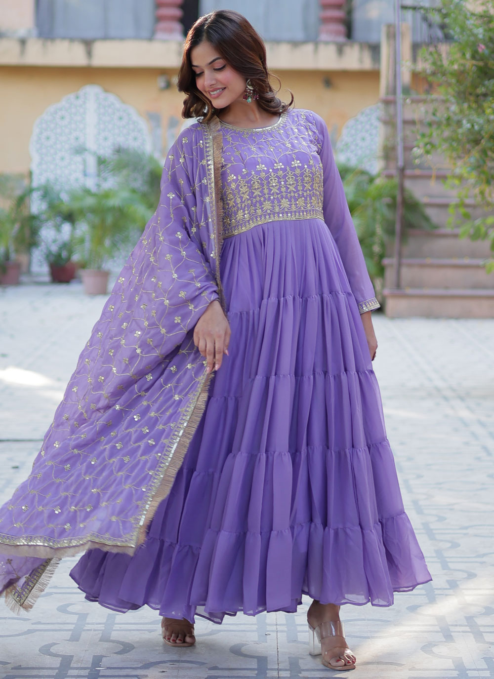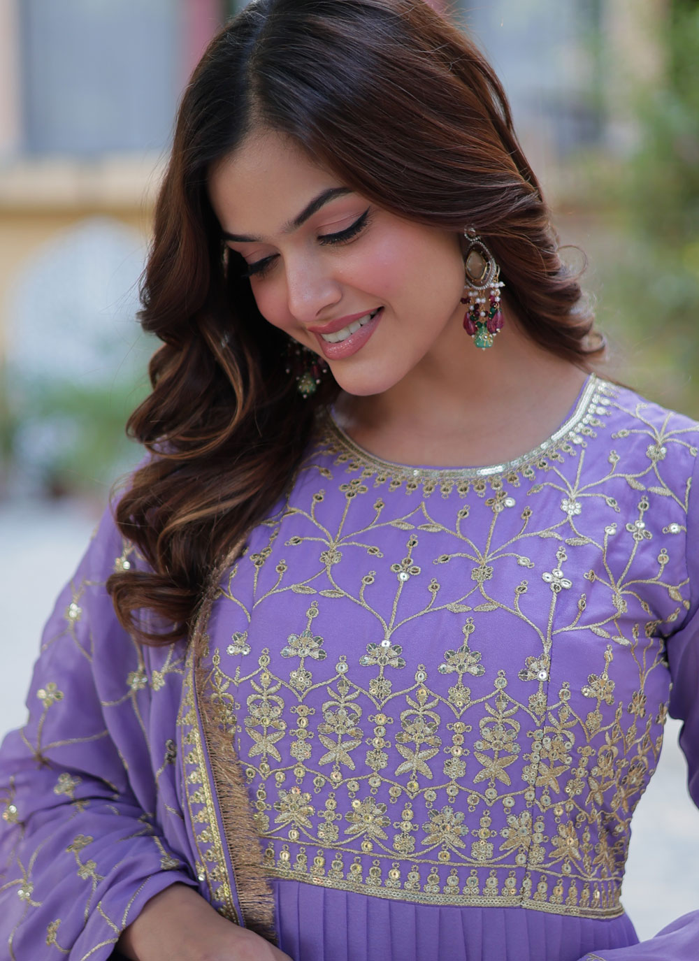 This Embroidered Sequins Work Readymade Gown in purple features intricate sequins embroidery, creating a glamorous and elegant look. The flattering silhouette and matching dupatta make it perfect for weddings, receptions, or festive occasions, blending tradition with modern style.
