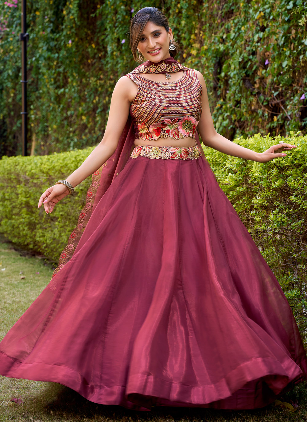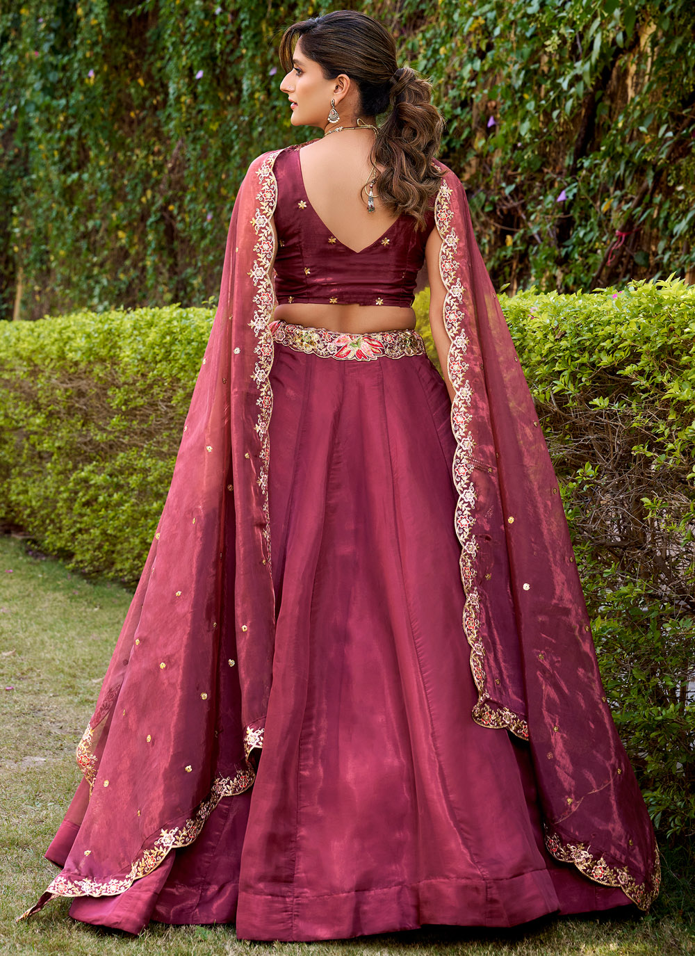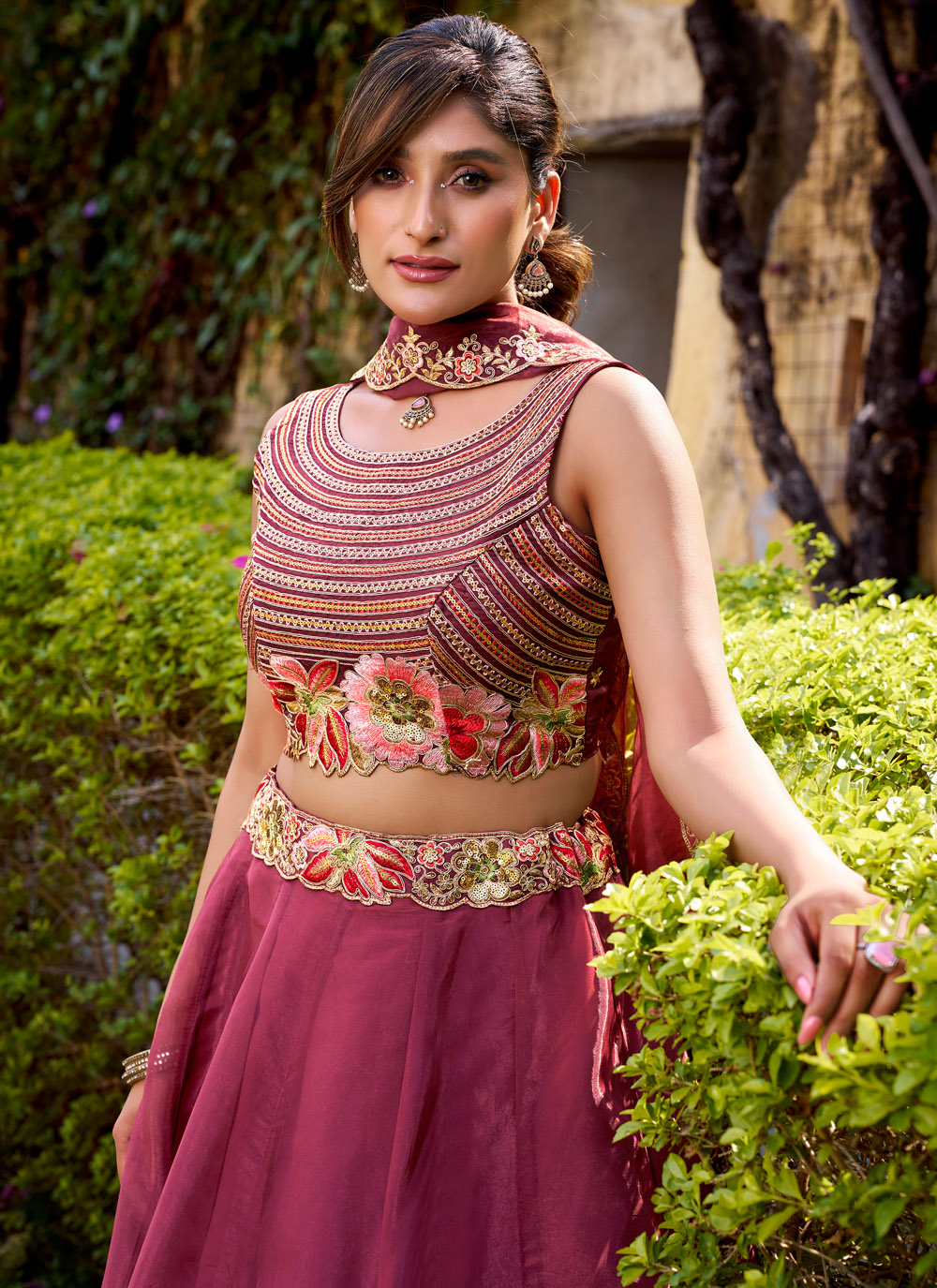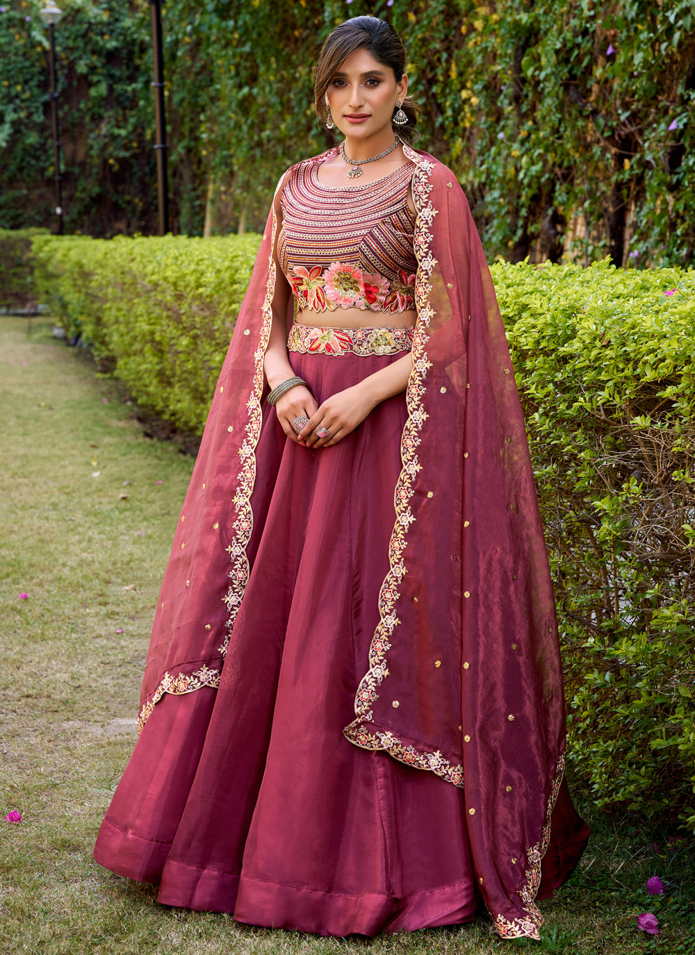 This silk pink engagement lehenga choli is adorned with fine thread embroidery and shimmering sequin work, creating a graceful and elegant ethnic look. The soft pink hue adds a romantic charm perfect for engagement celebrations. Comes with matching choli and dupatta.