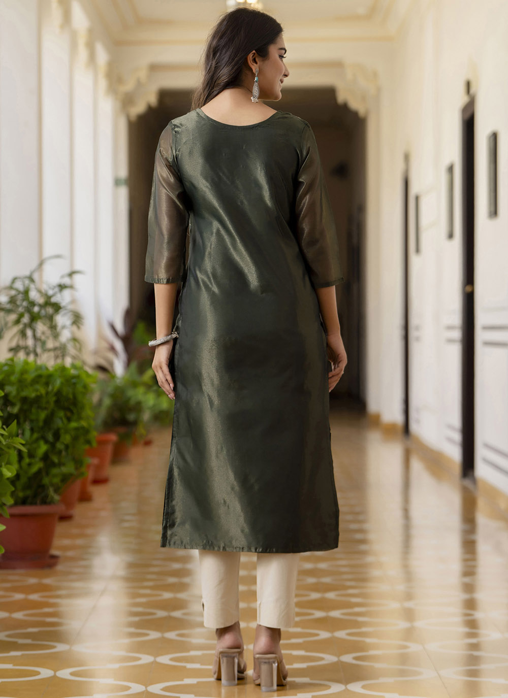 Make a stylish statement with this Green Silk Blend Designer Kurti, adorned with delicate embroidered patterns that exude subtle sophistication. The rich texture of silk blend fabric ensures a luxurious yet comfortable fit, perfect for office wear, casual gatherings, or small festivities.