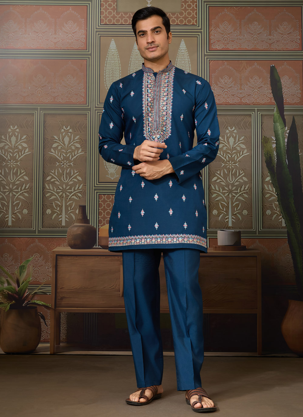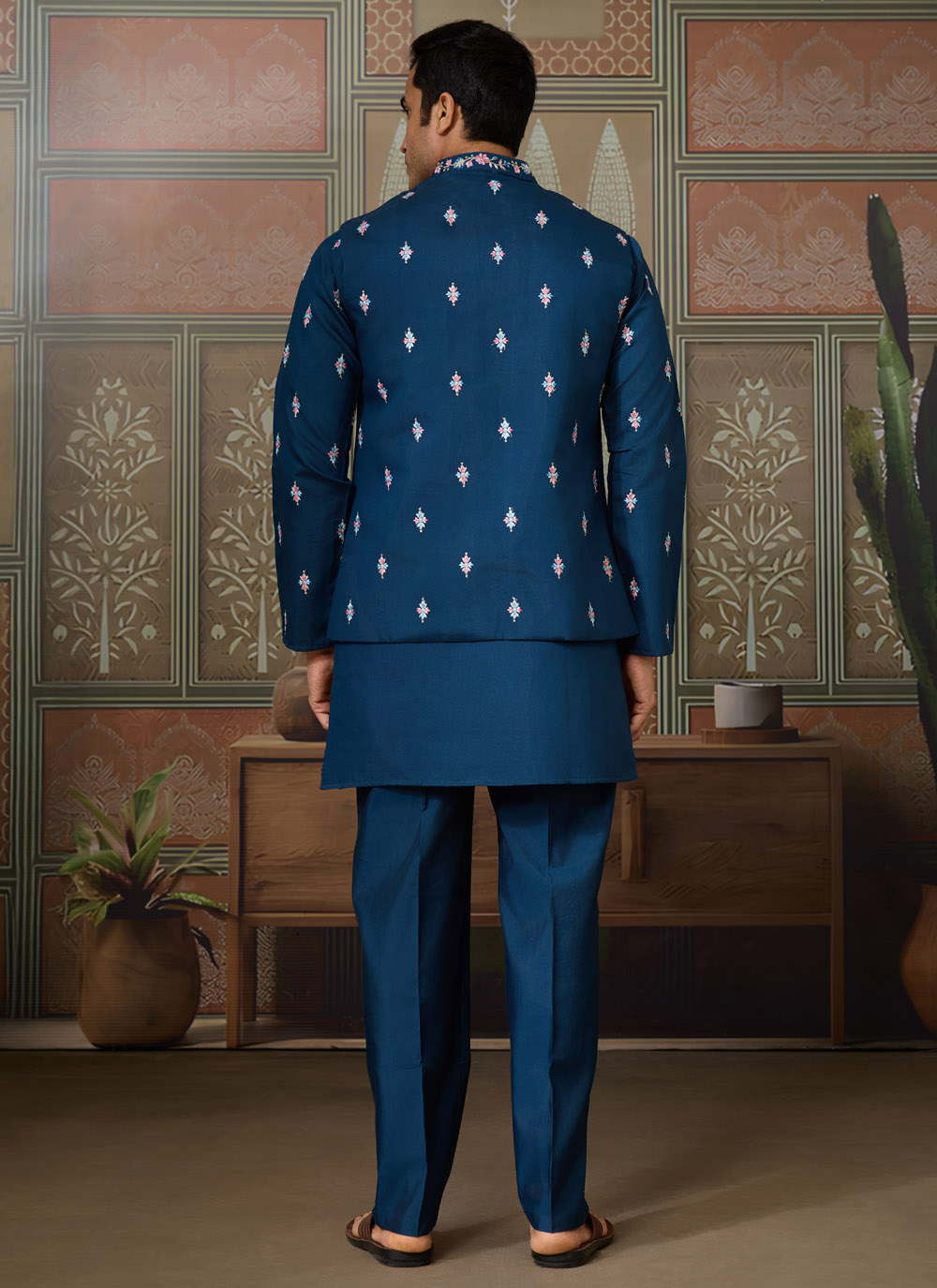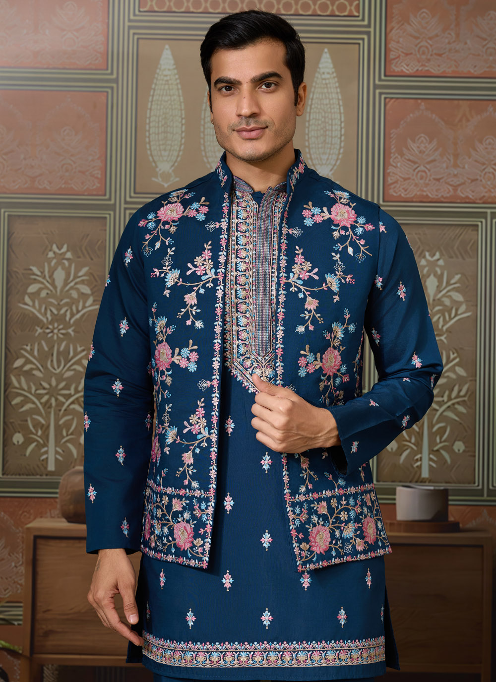 This men’s kurta pajama in blue silk fabric is adorned with fine embroidery for a graceful touch. The stylish jacket adds depth and dimension, creating a statement piece ideal for celebrating tradition with a modern outlook.