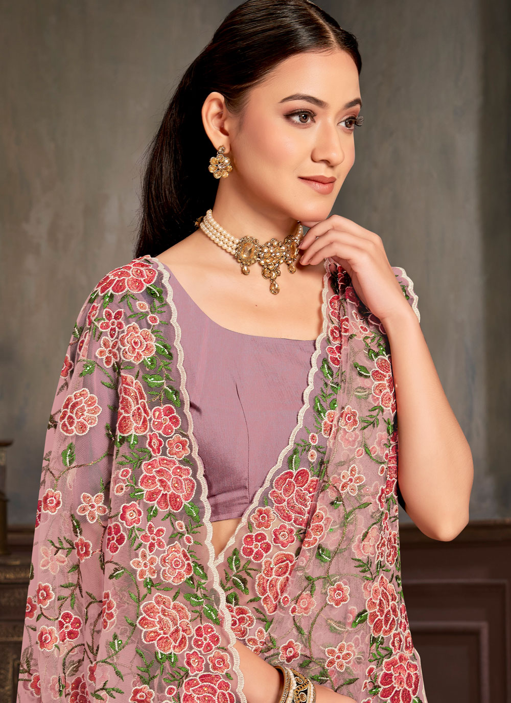 Elevate your wardrobe with this beautifully crafted Lavender Net Saree, featuring intricate embroidery, stone accents, and zari detailing. Complete with a matching blouse, it’s ideal for festive events or elegant gatherings.