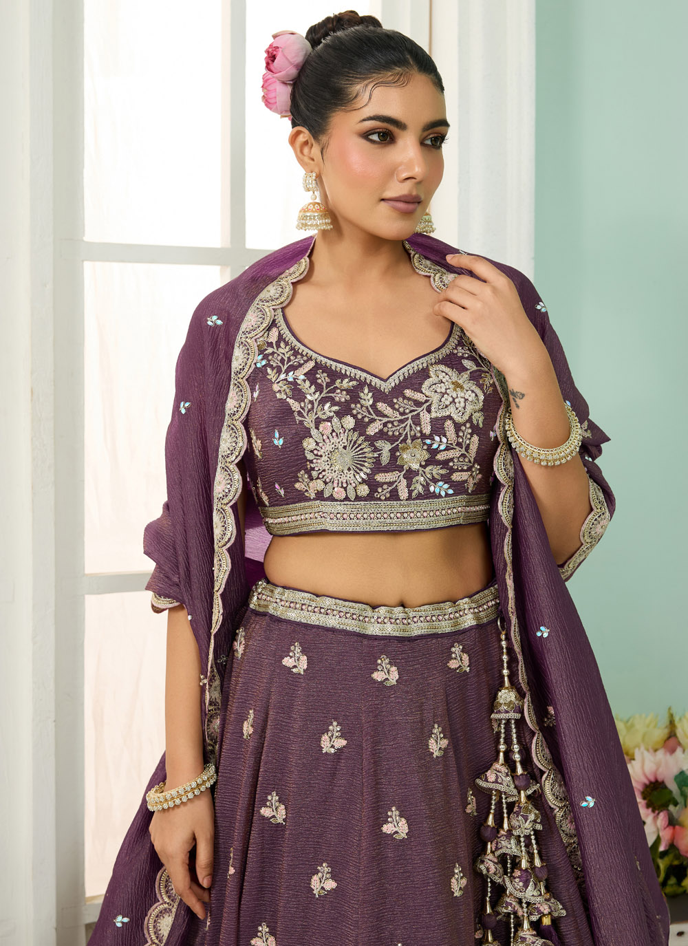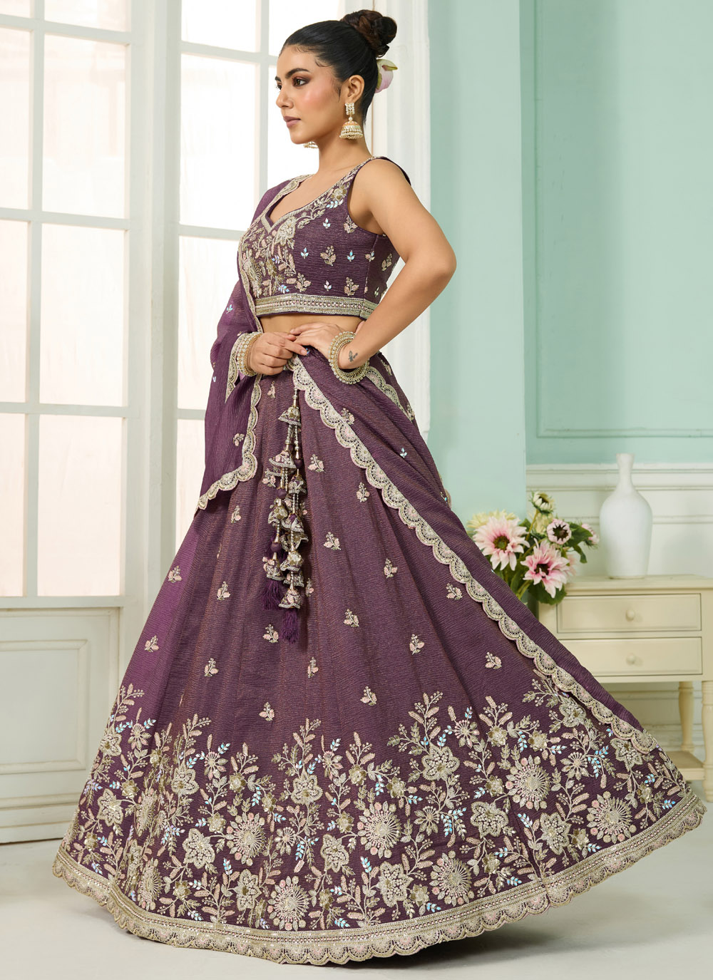 This purple tissue lehenga choli blends classic artistry with contemporary styling. Adorned with sparkling sequins, stone accents and delicate thread embroidery, it is finished with cutwork borders that make it an irresistible choice for reception wear. Comes with matching choli and dupatta.