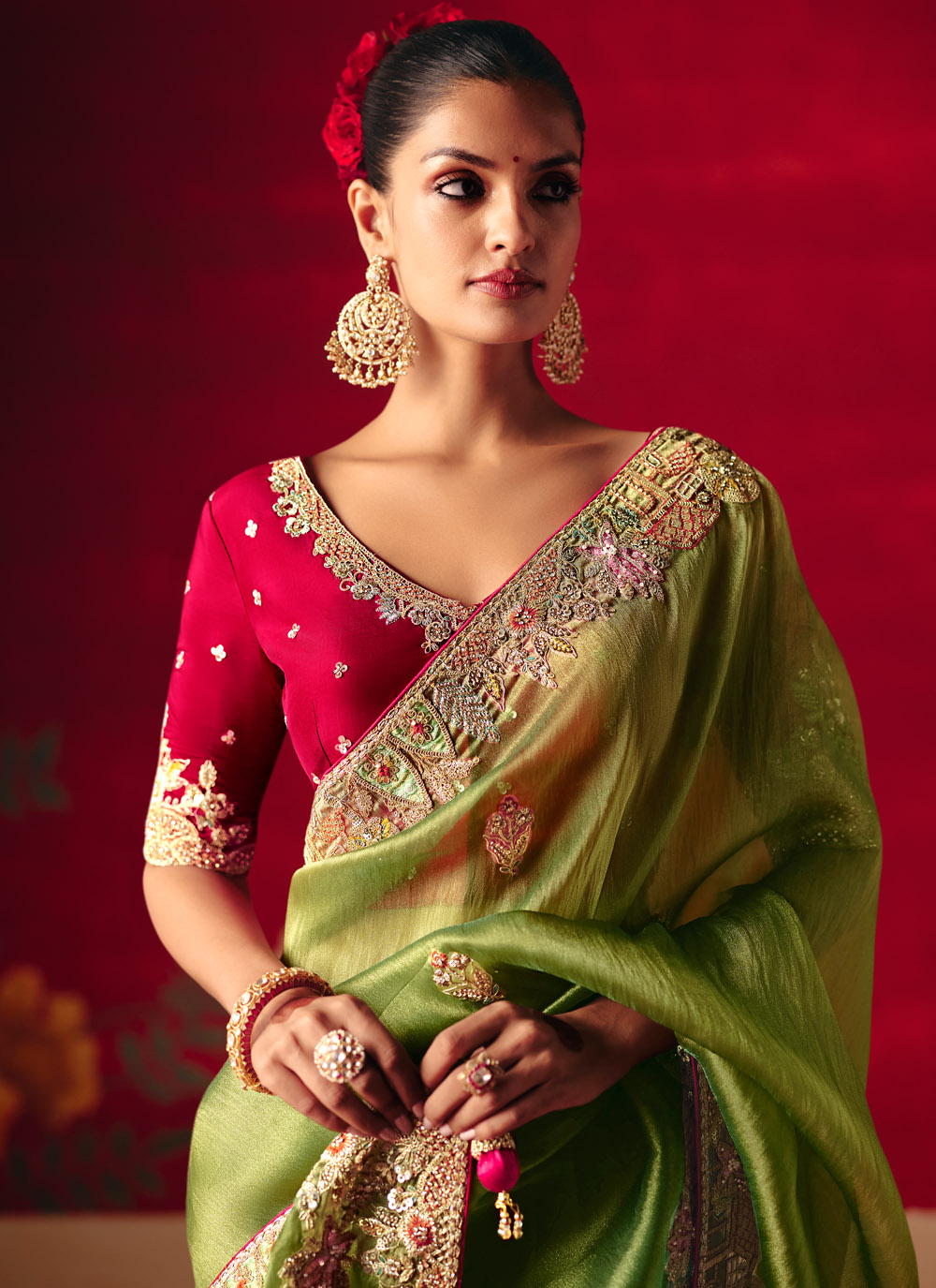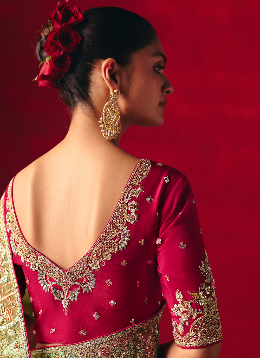 Enhance your ethnic wardrobe with this embroidered green saree showcasing fine butti patterns and sequin detailing. The balanced blend of traditional artistry and modern design offers a graceful festive appearance. Comes with matching blouse.