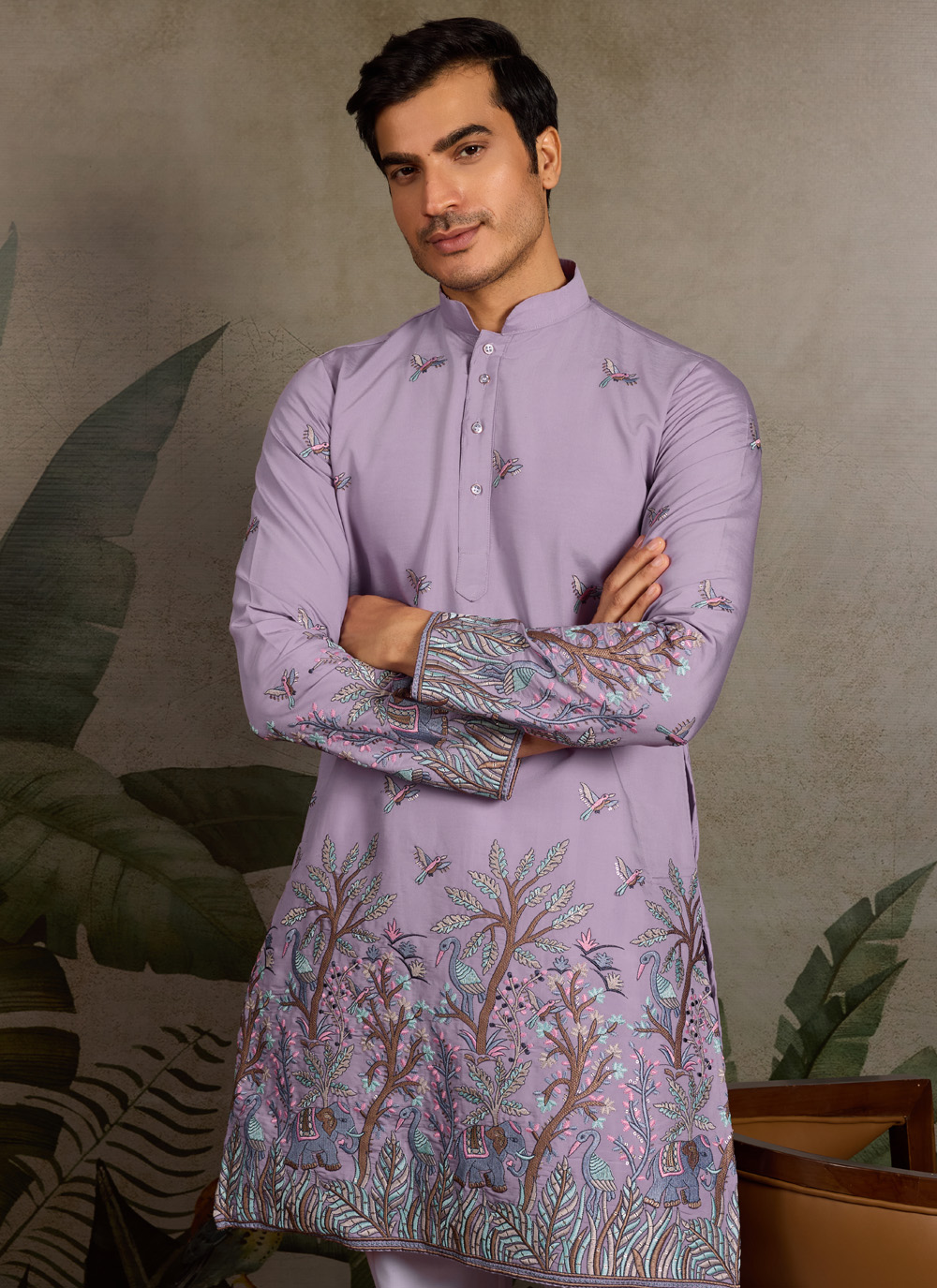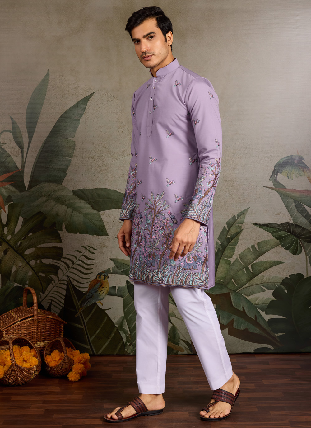 This viscose silk men’s kurta in soft lavender is beautifully adorned with fine thread embroidery and sequins highlights, giving it a refined look that’s perfect for wedding functions and festive celebrations.