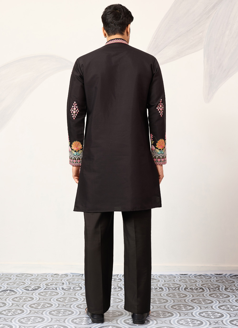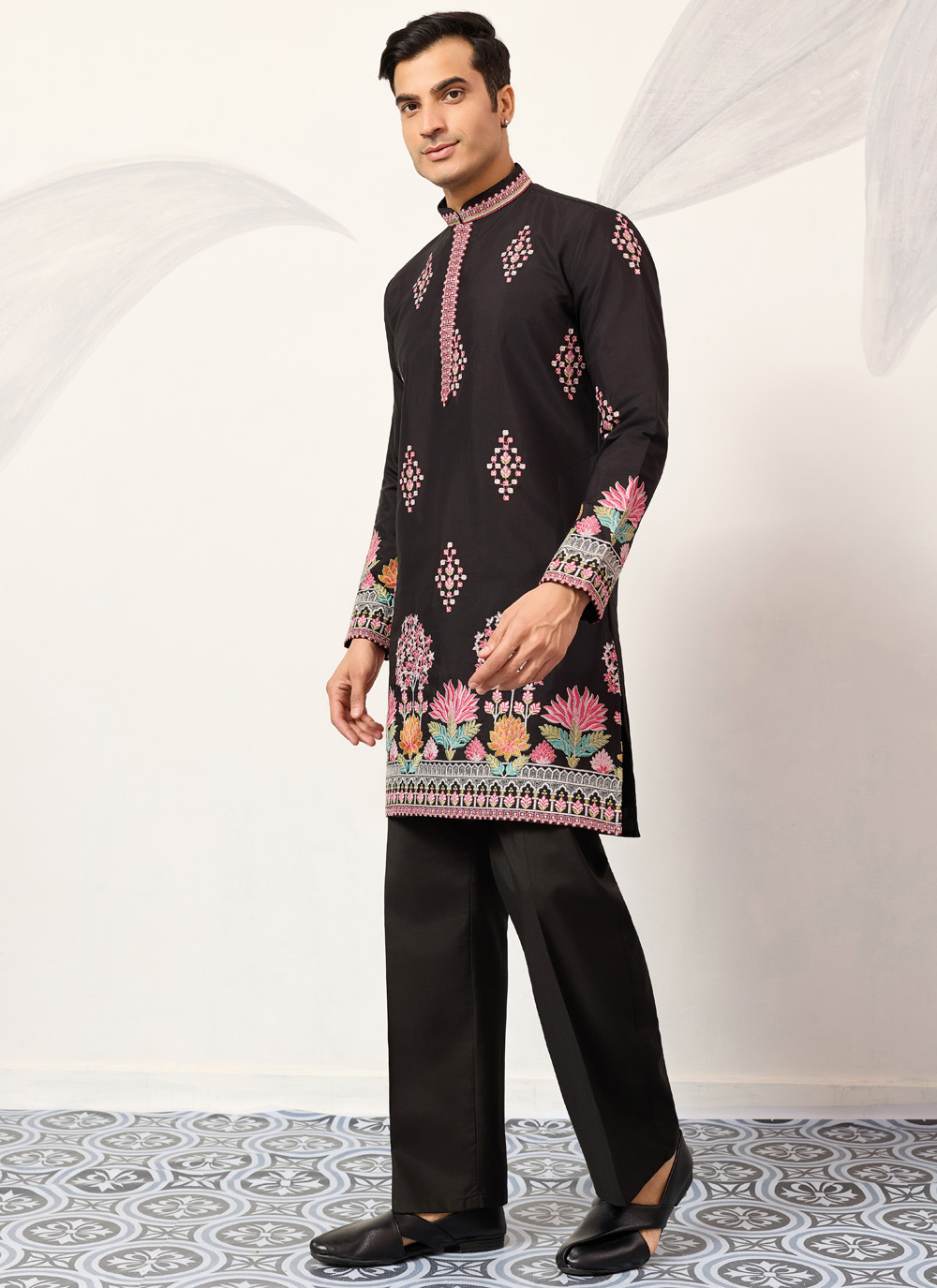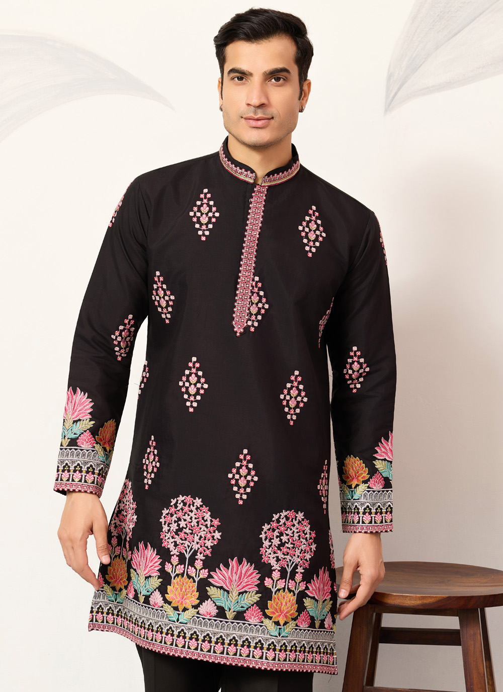 Shop this stylish black viscose silk men’s kurta designed for a bold and elegant look. The kurta features fine embroidery that adds a rich designer touch while keeping it comfortable.