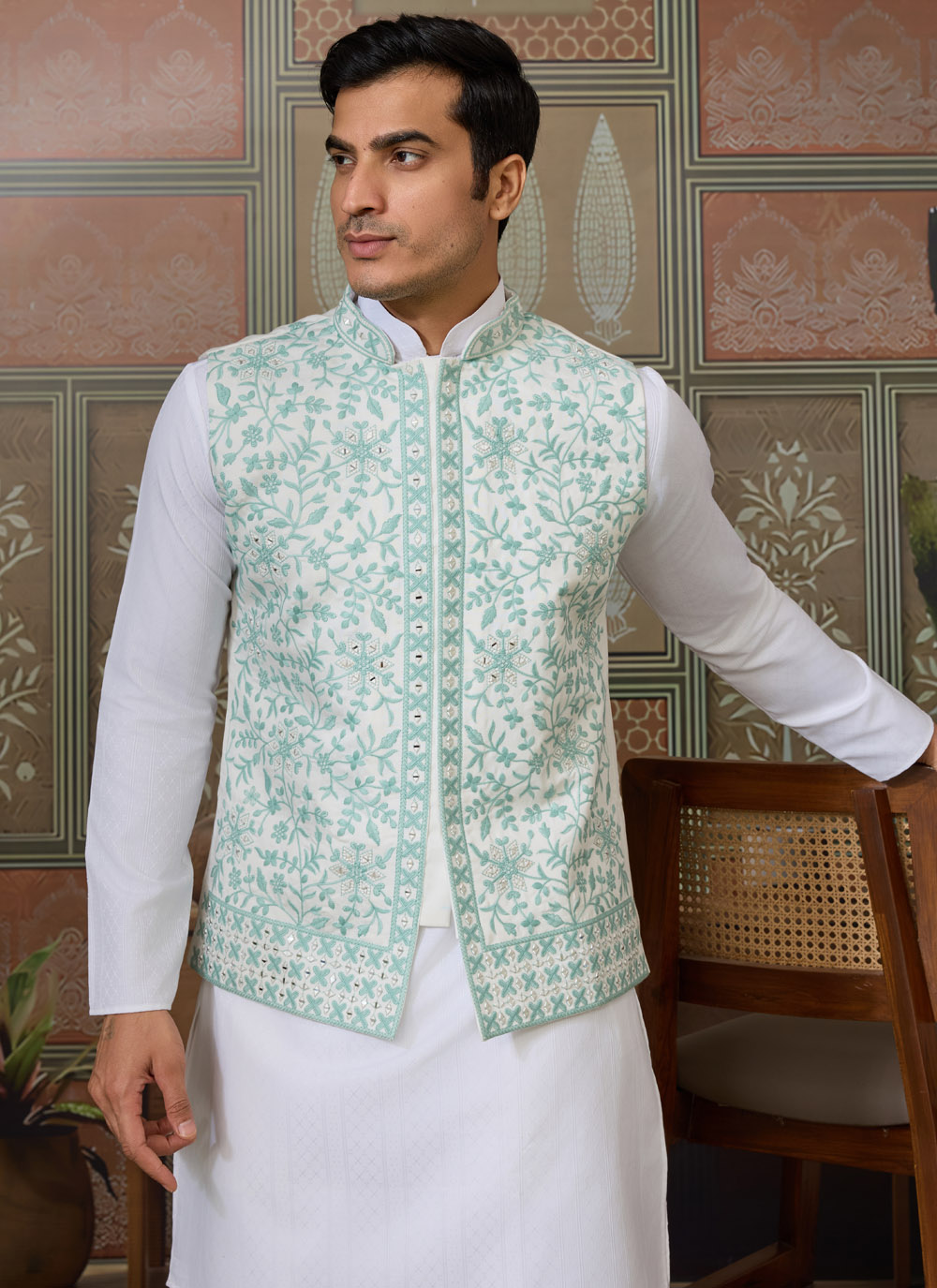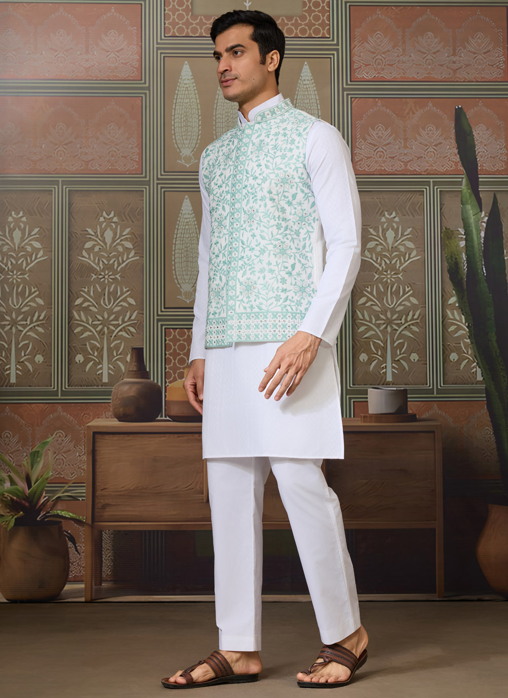 Exude elegance with this silk ceremonial kurta pajama and jacket designed with fine thread mirror work. The combination of white purity and green richness makes it a striking choice for traditional events and family celebrations.