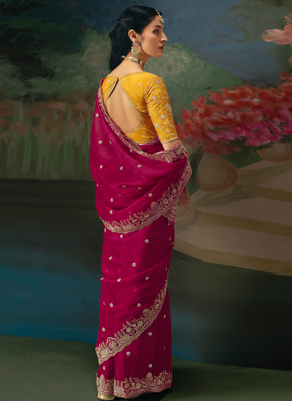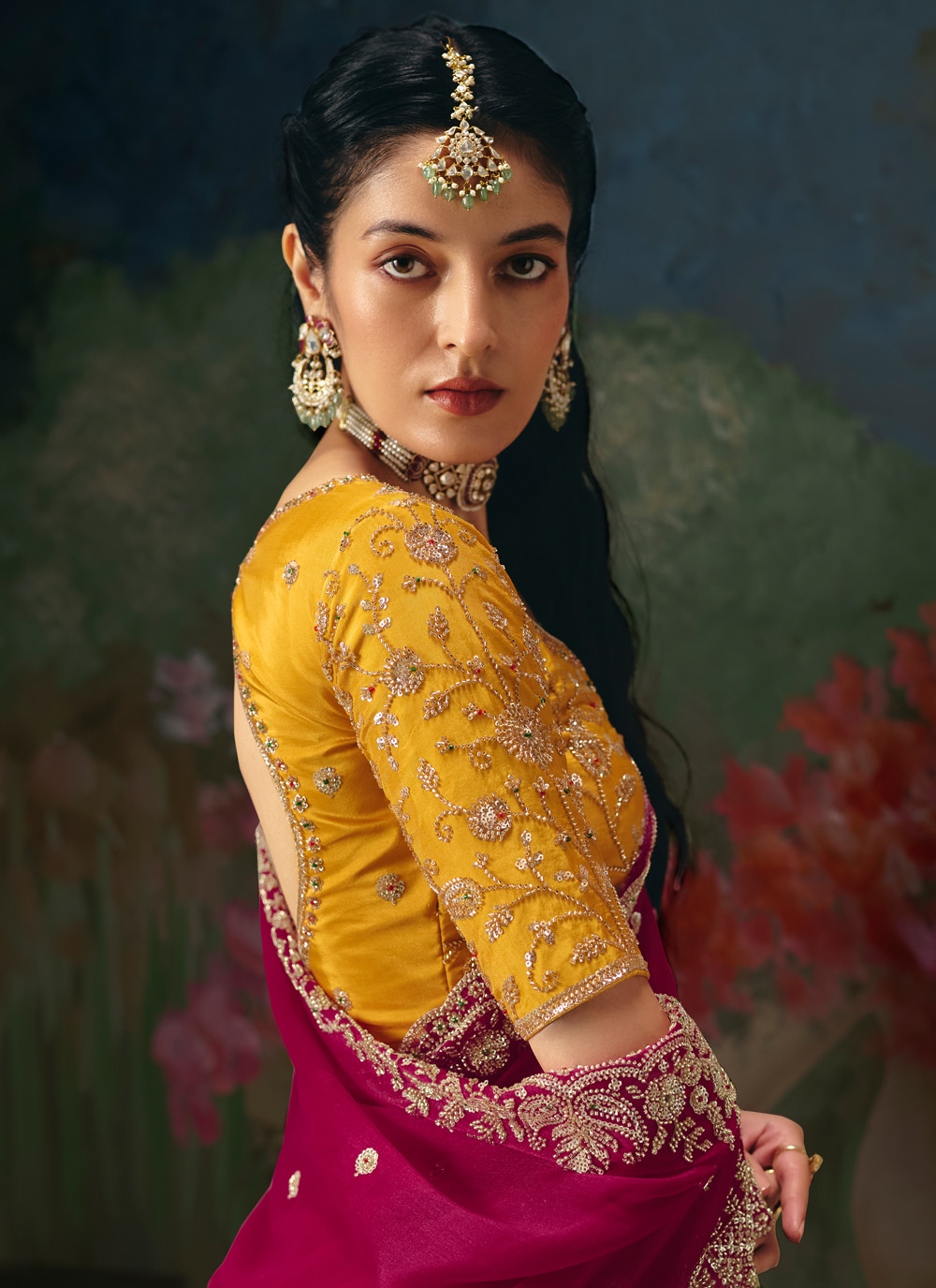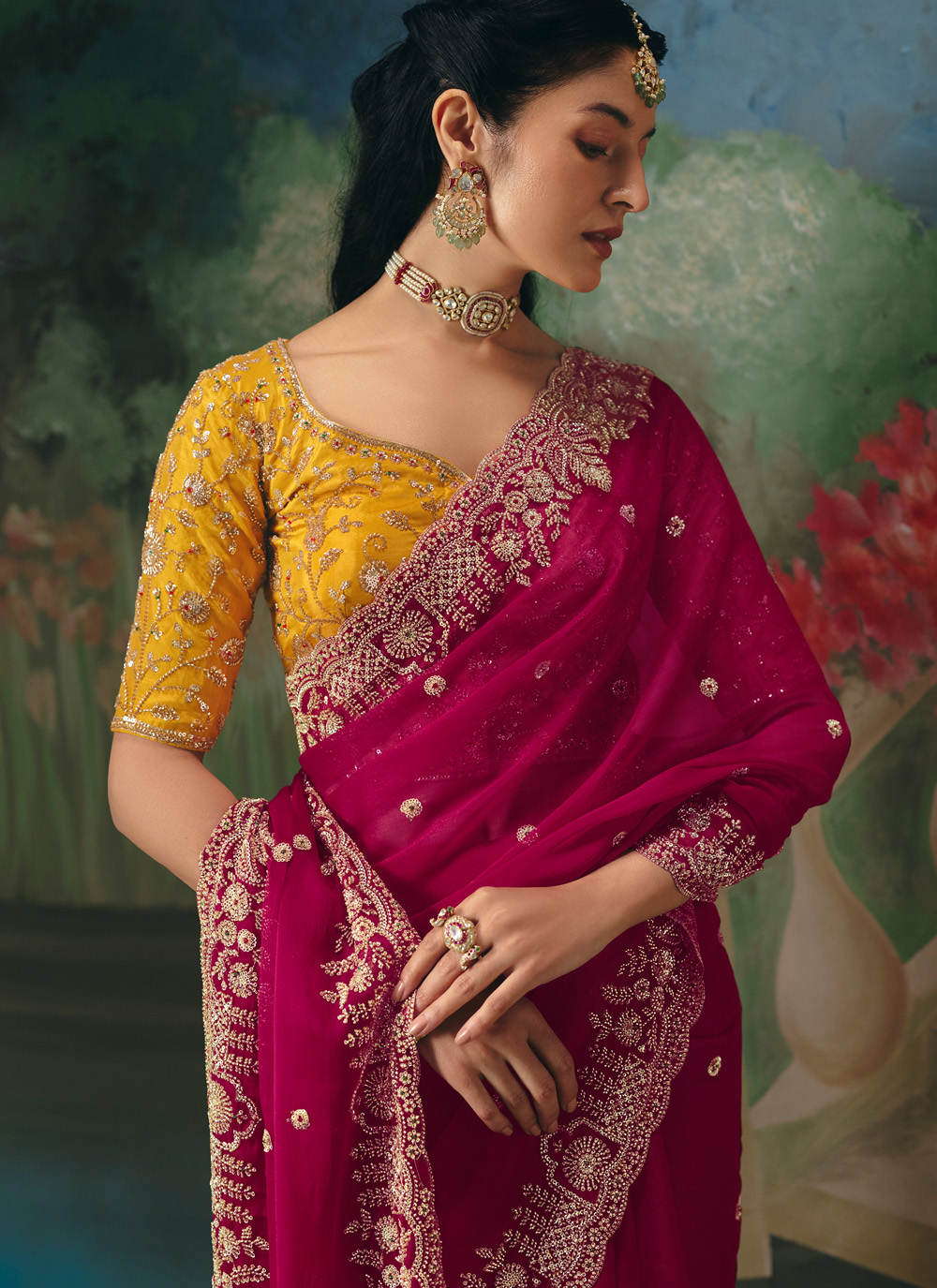 Celebrate modern elegance with this Rani Designer Saree featuring delicate beadwork embroidery. The rich tone symbolizes joy and confidence, while the contemporary design adds a fashionable edge. Comes with matching blouse.