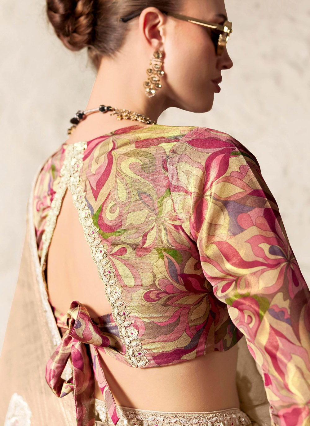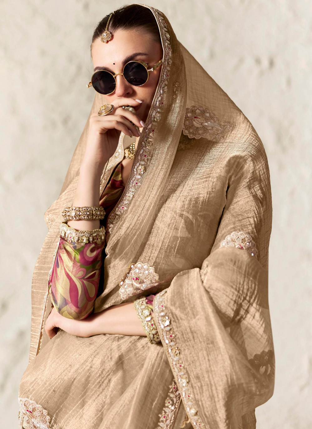 This cream sequins thread embroidered saree is designed to deliver timeless elegance. The delicate detailing brings a refined shimmer, while the smooth fabric ensures a comfortable and flattering drape for long wedding events and ceremonies. Comes with matching blouse.