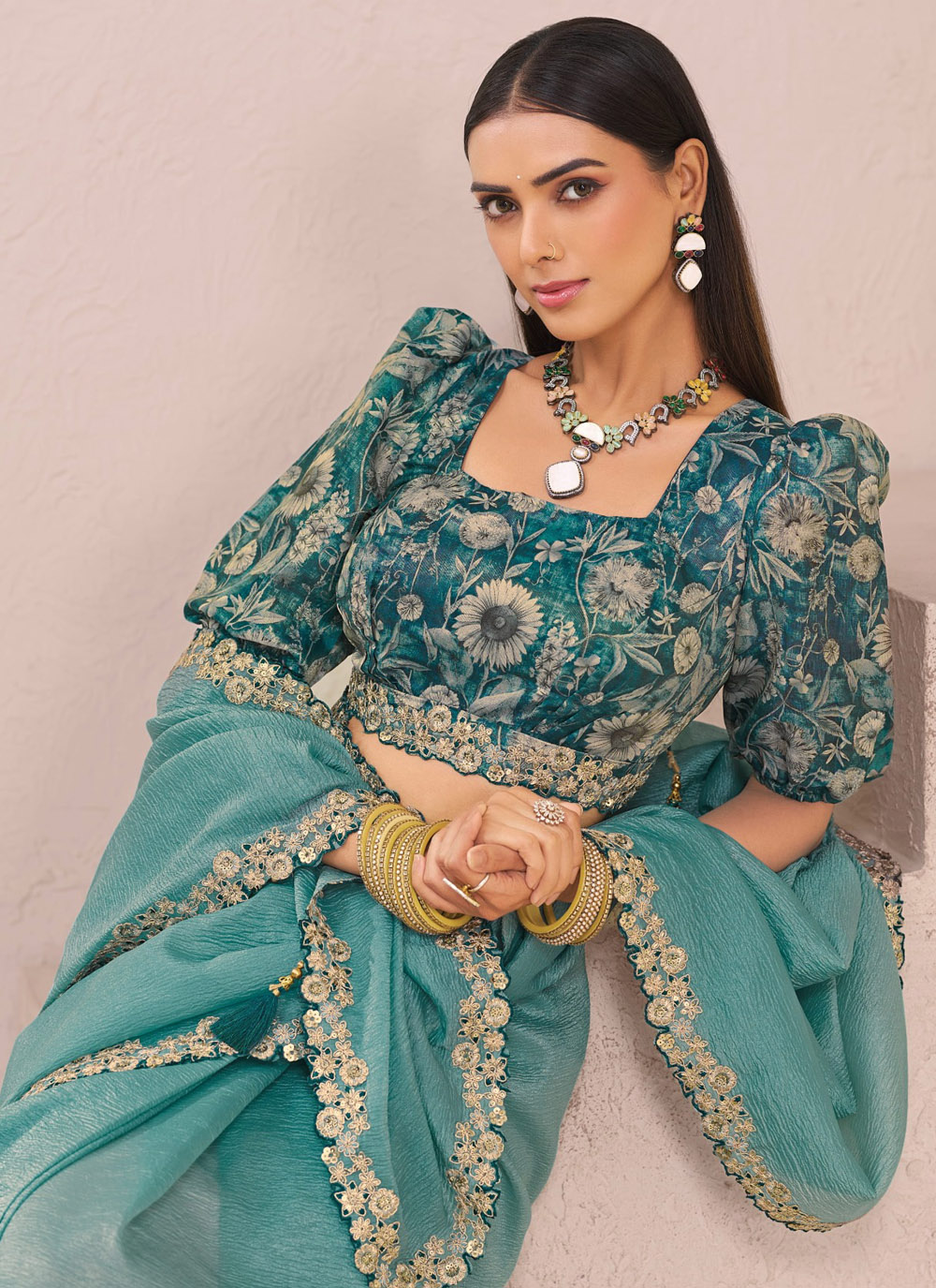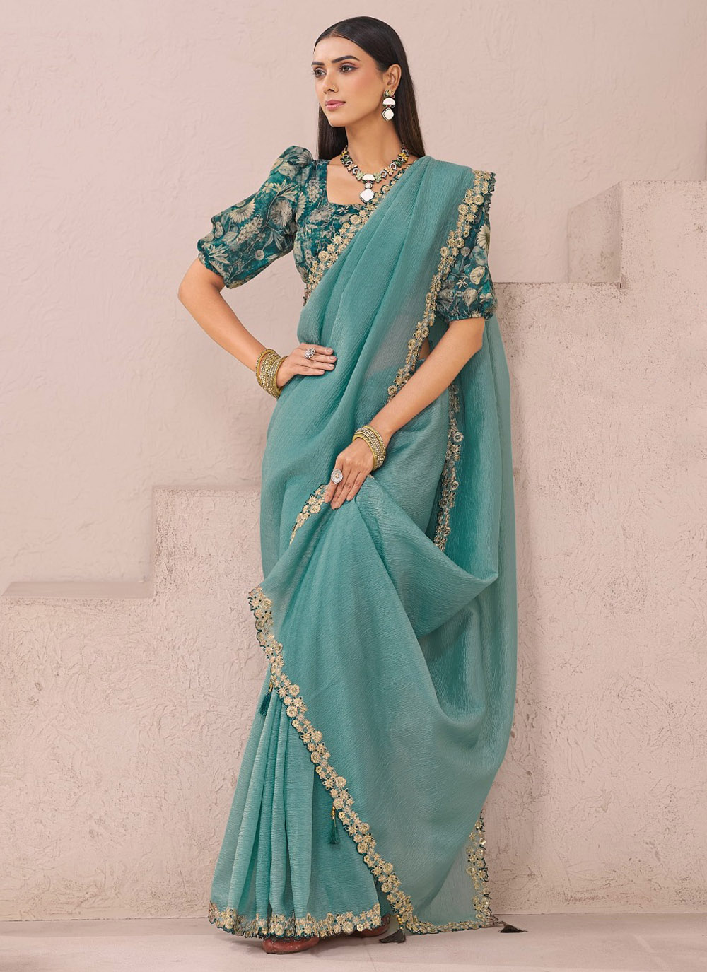 Elevate your ethnic wardrobe with this elegant fancy saree in Rama tone, showcasing classic embroidery on the border and detailed cut work that adds modern flair. Ideal for weddings, receptions or any traditional occasion. Comes with matching blouse.