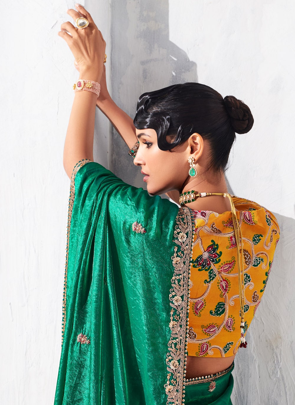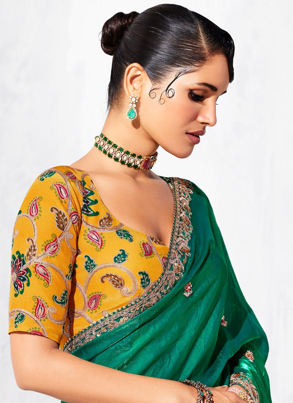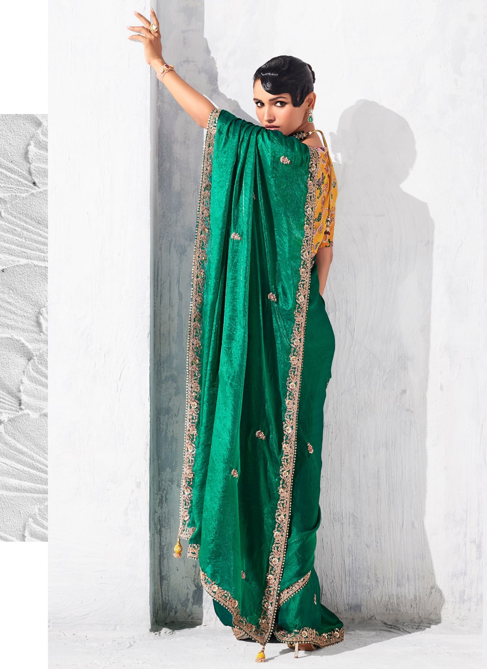 This trendy green saree crafted in premium fancy fabric features intricate embroidery with charming butti designs and ornate borders. Its lightweight texture and modern appeal make it an ideal choice for wedding, receptions or traditional festivities. Comes with matching blouse.