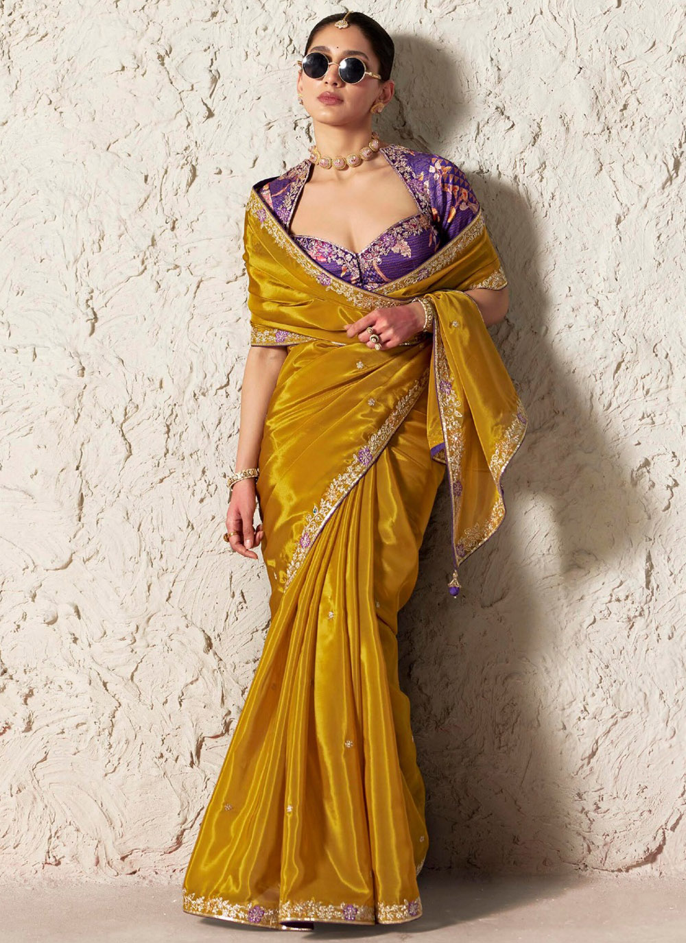 Step into effortless elegance with this mustard designer saree crafted from premium fancy fabric. Adorned with delicate sequins and fine thread work, this saree offers a beautiful balance of shimmer and sophistication. Comes with matching blouse.