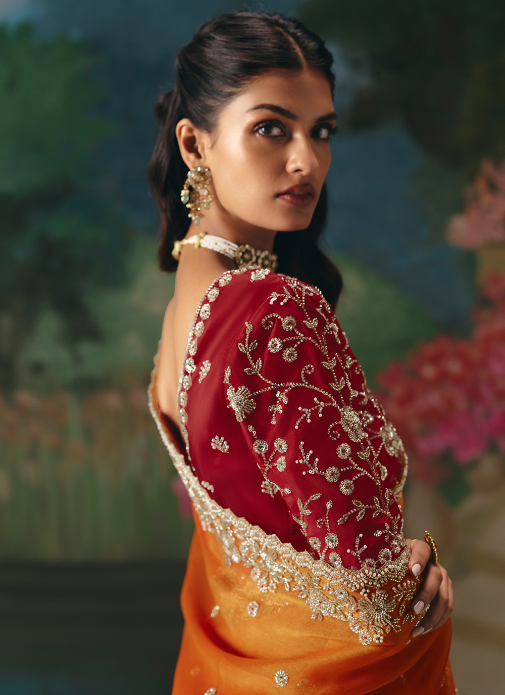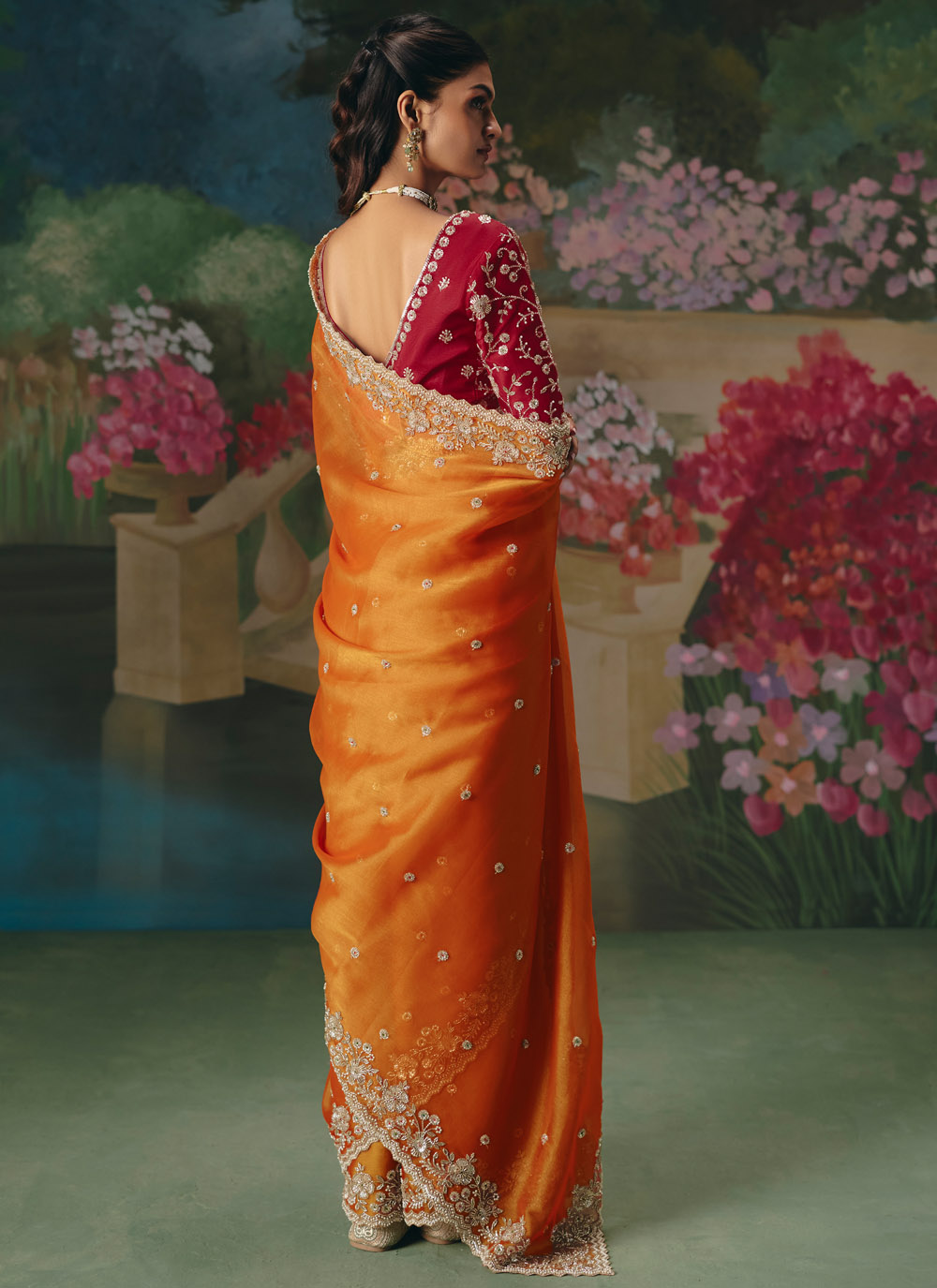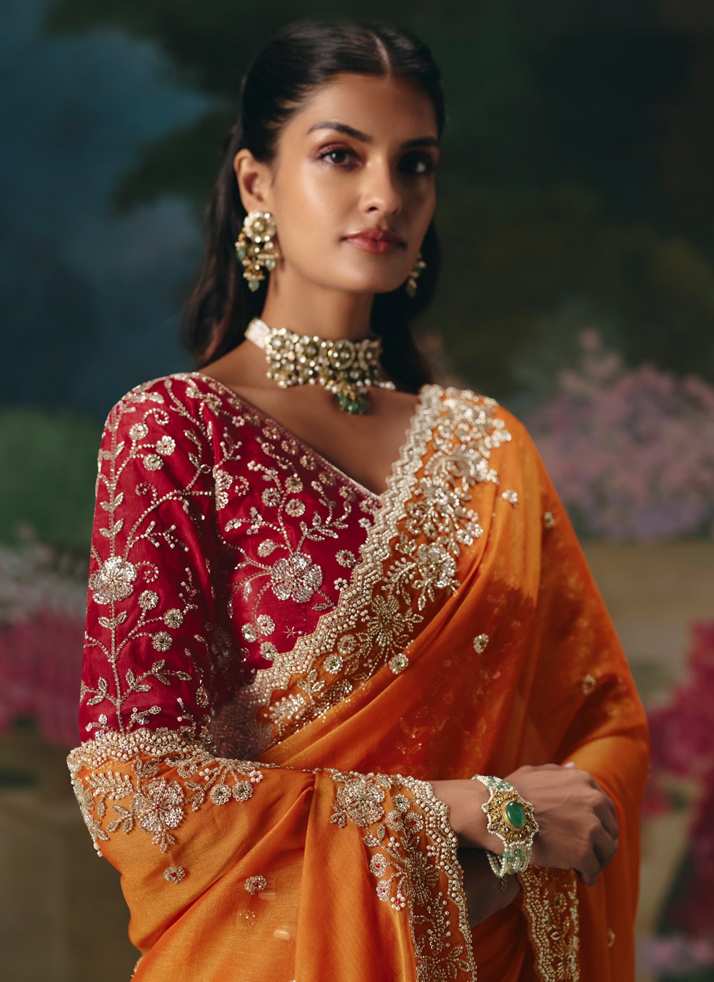 Glow with confidence in this Fancy Fabric Orange Beads Sequins Stone Embroidered Trendy Engagement Saree. Designed to stand out, this saree features detailed embroidery enhanced with sparkling sequins, delicate bead accents and elegant stone work. Comes with matching blouse.