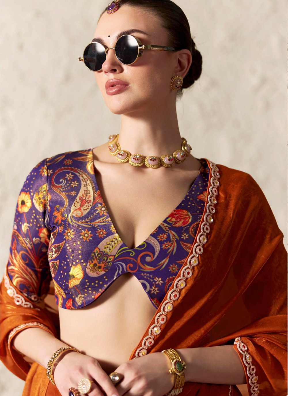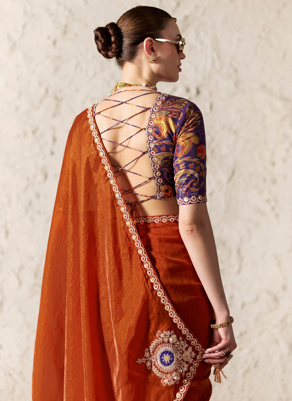 Crafted for modern elegance, this orange contemporary saree blends intricate thread embroidery with delicate sequins highlights. The refined design and fluid drape make it suitable for both daytime events and evening gatherings. Comes with matching blouse.