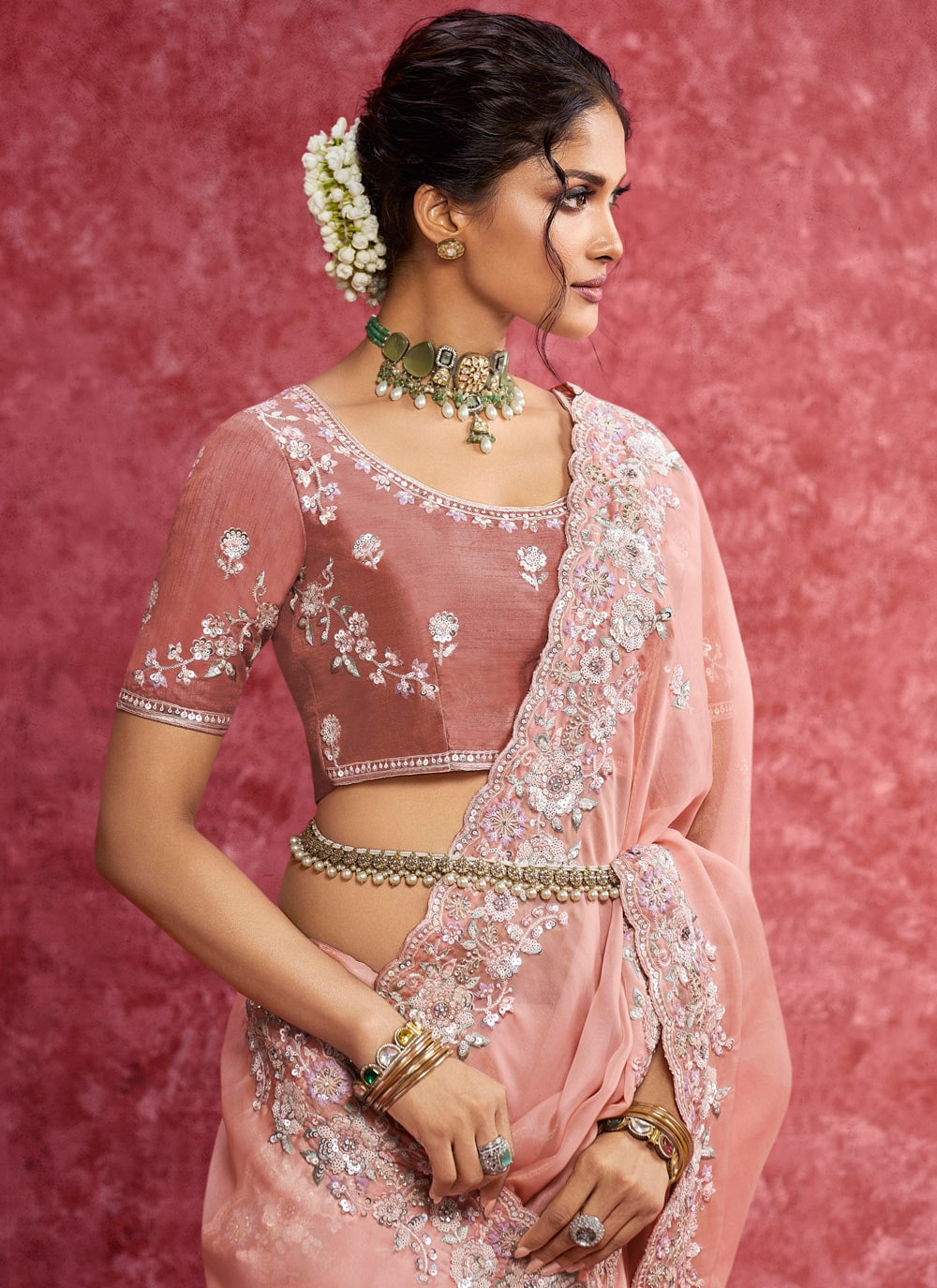 Crafted from premium fancy fabric, this peach designer saree highlights thread embroidery and sequins embellishment. The cut work border gives it a chic and elegant finish. Comes with matching blouse.