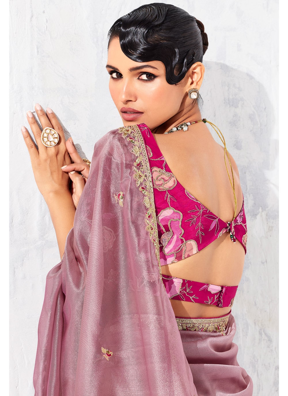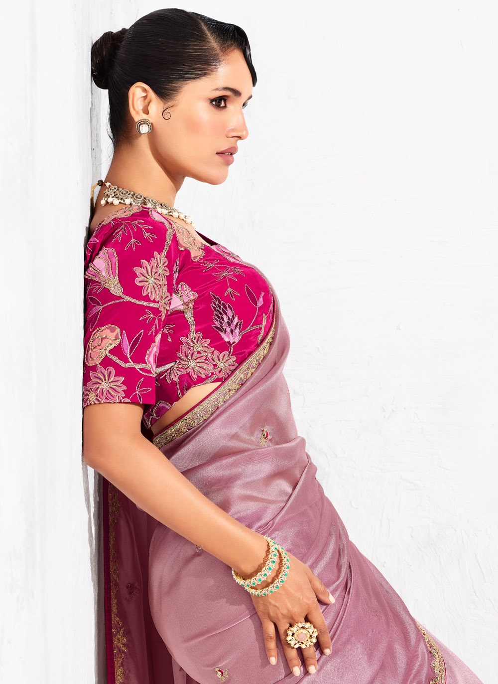 This trendy pink embroidered saree crafted from fancy fabric blends elegance with comfort. The stunning border embroidery enhances its charm, giving you a refined and feminine look suitable for parties and receptions. Comes with matching blouse.