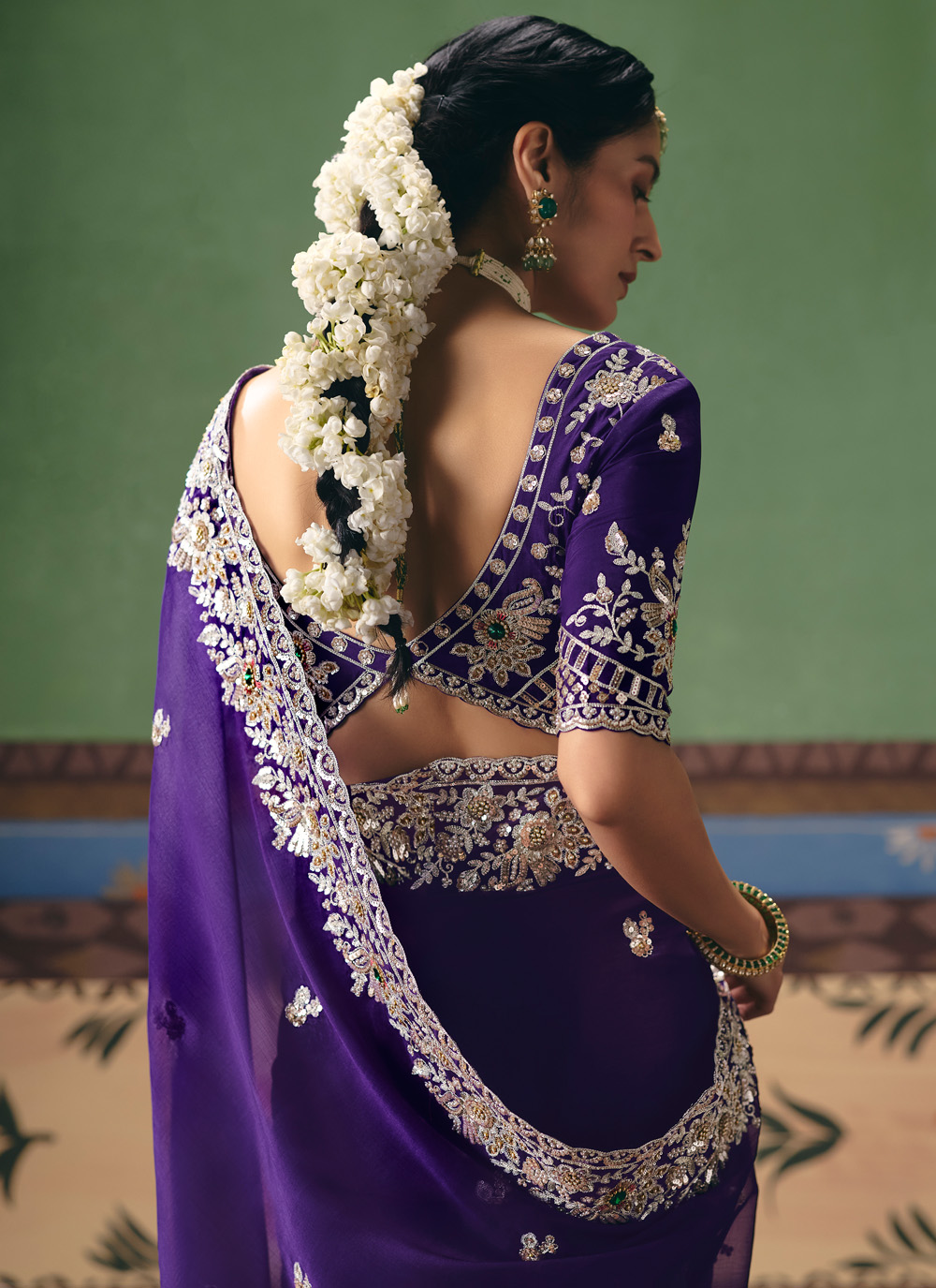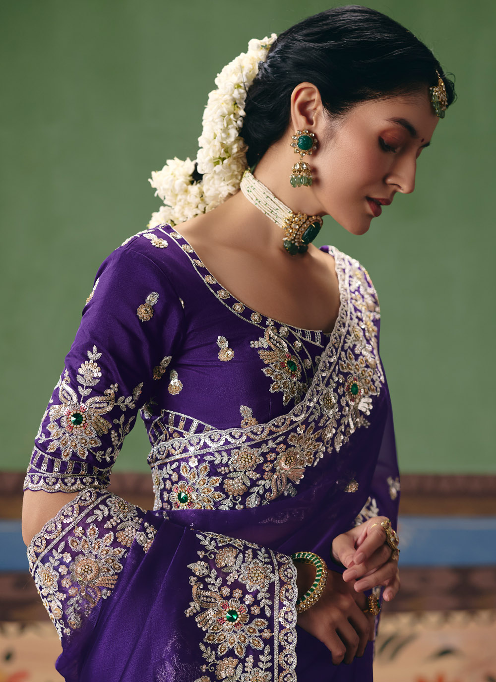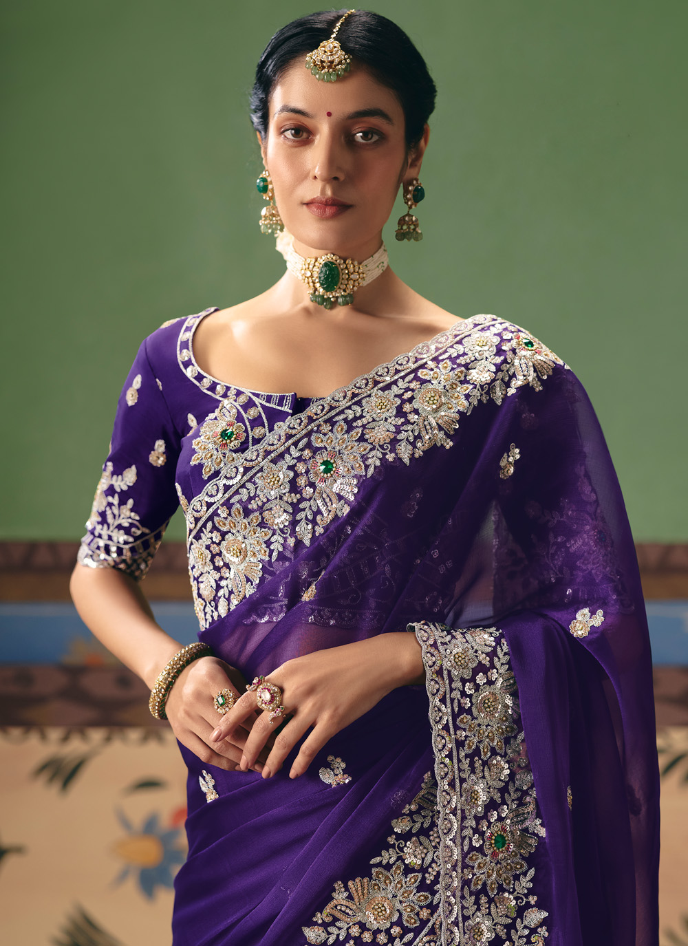 Add a royal touch to your ethnic wardrobe with this Purple Sequins Stone Pearls Embroidered Traditional Saree. Crafted from high-quality fancy fabric, it provides a soft feel and elegant flow. Comes with matching blouse.