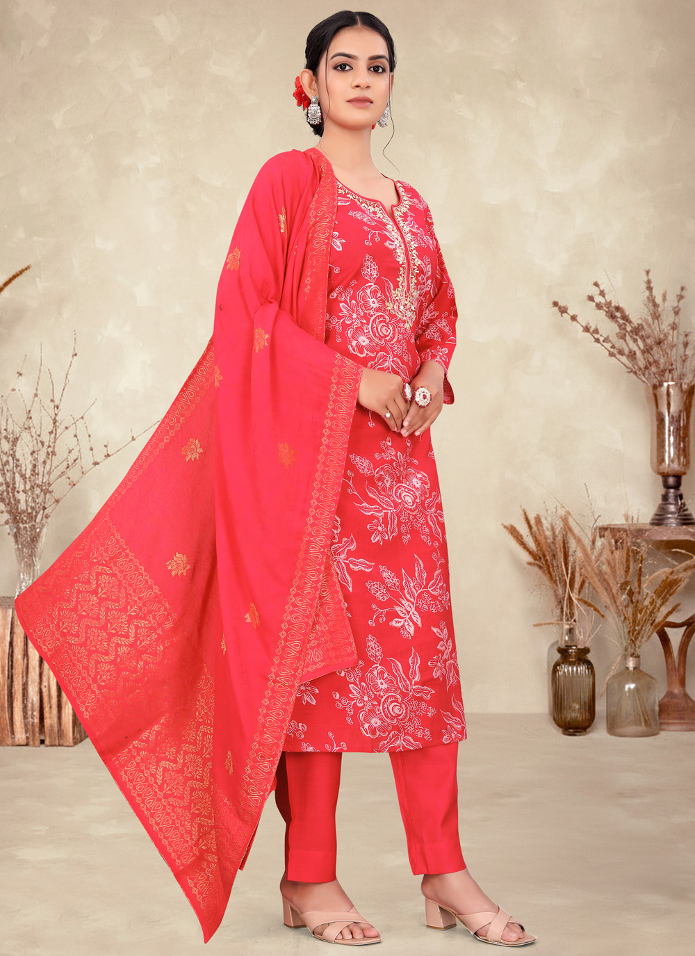 This red fancy fabric salwar kameez brings together elegant embroidery and stylish foil print for a festive, eye-catching look. The smooth material drapes well and adds comfort, making it a perfect choice for celebrations and cultural events. Comes with matching bottom and dupatta