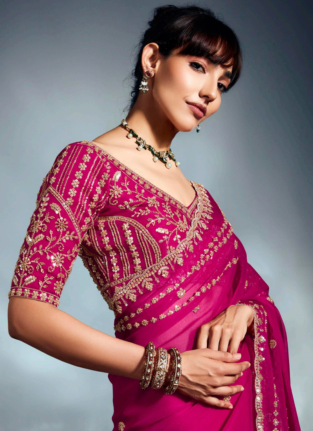 Elevate your wedding style with this fuchsia saree crafted in fine fancy fabric. Embellished with sequins, moti, khatli and cutdana embroidery, it combines festive charm with a designer look. Comes with matching blouse.