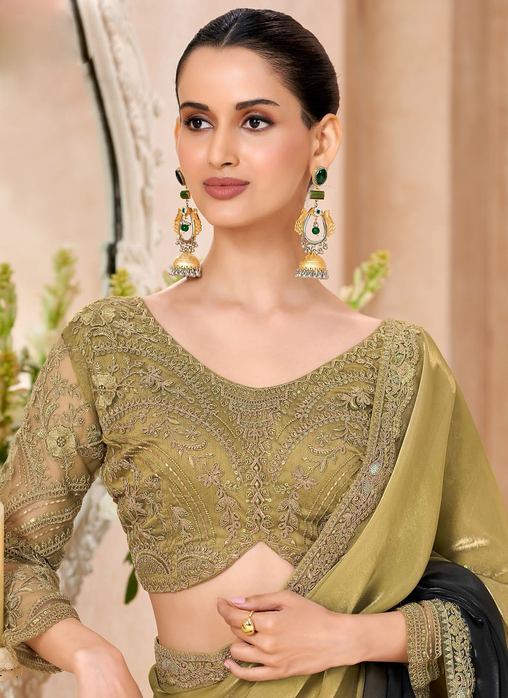 Celebrate festivals in graceful style with this Fandy Green Border Embroidered Festival Classic Saree. The rich green shade paired with elegant embroidered border work creates a timeless ethnic appeal. Comes with matching blouse.
