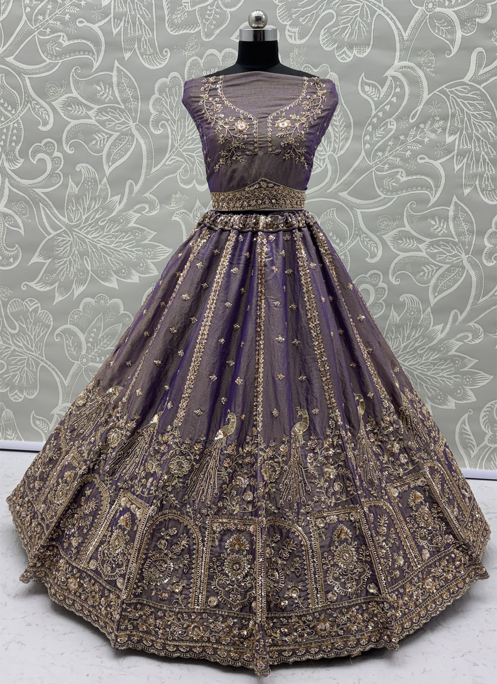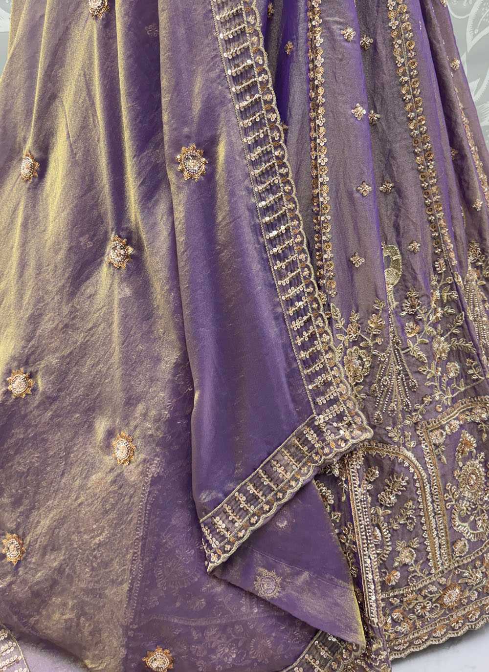 This Lavender Organza Silk Lehenga Choli highlights intricate zari patterns complemented by crystal and sequin accents. Its graceful tone and stylish silhouette offer a sophisticated look for special occasions. Comes with matching choli and dupatta.