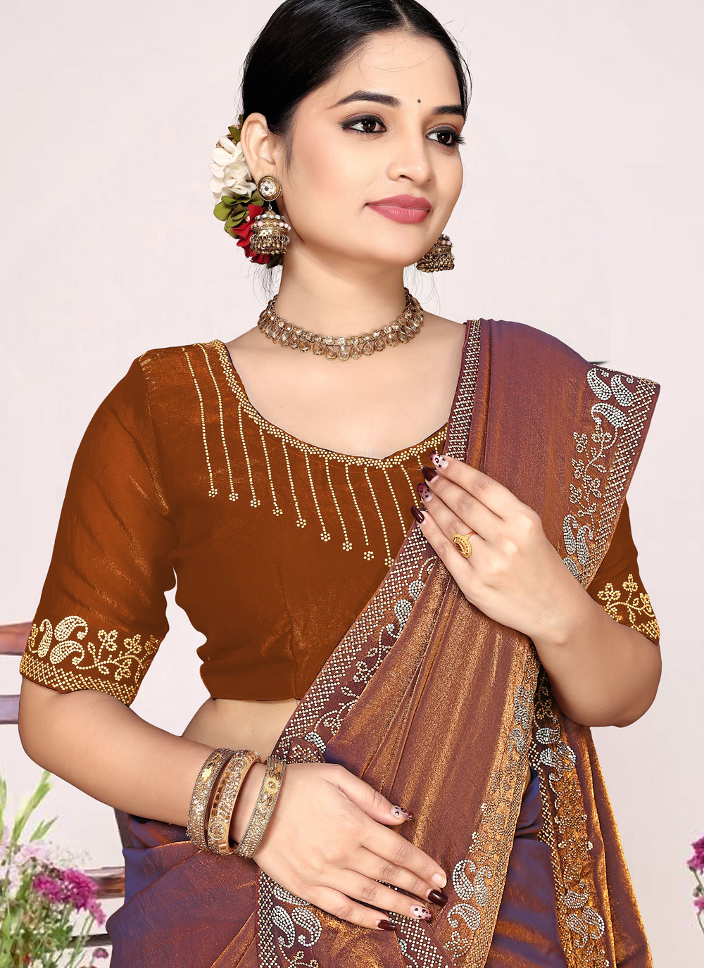 This Rust Contemporary Saree in Fandy Satin Silk showcases a harmonious combination of smooth fabric and detailed craftsmanship. The subtle zarkan embellishments bring a touch of sparkle that highlights the saree’s elegant appearance. Comes with matching blouse.