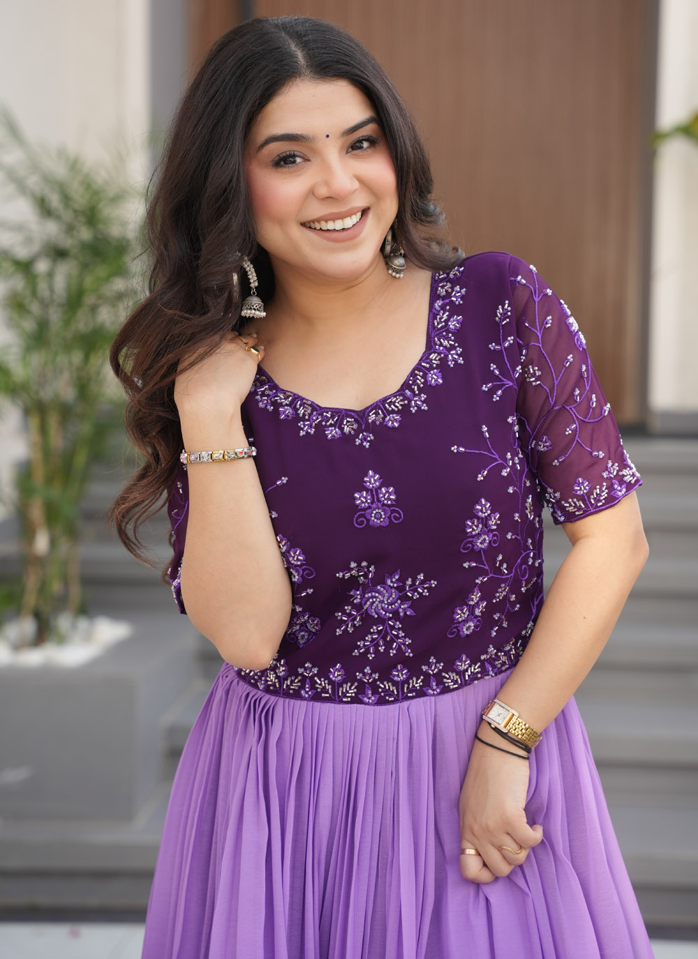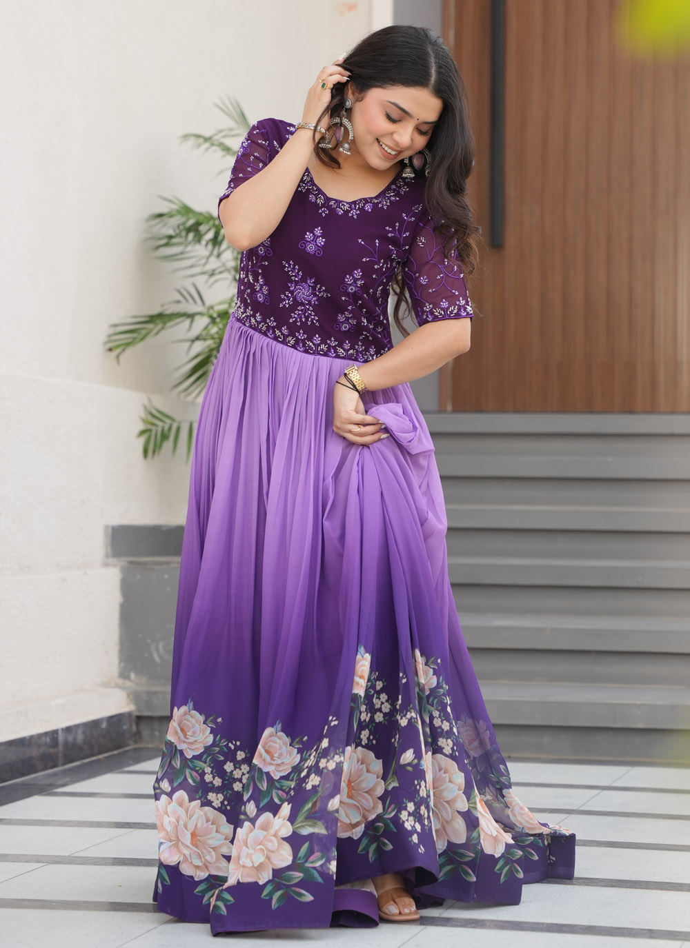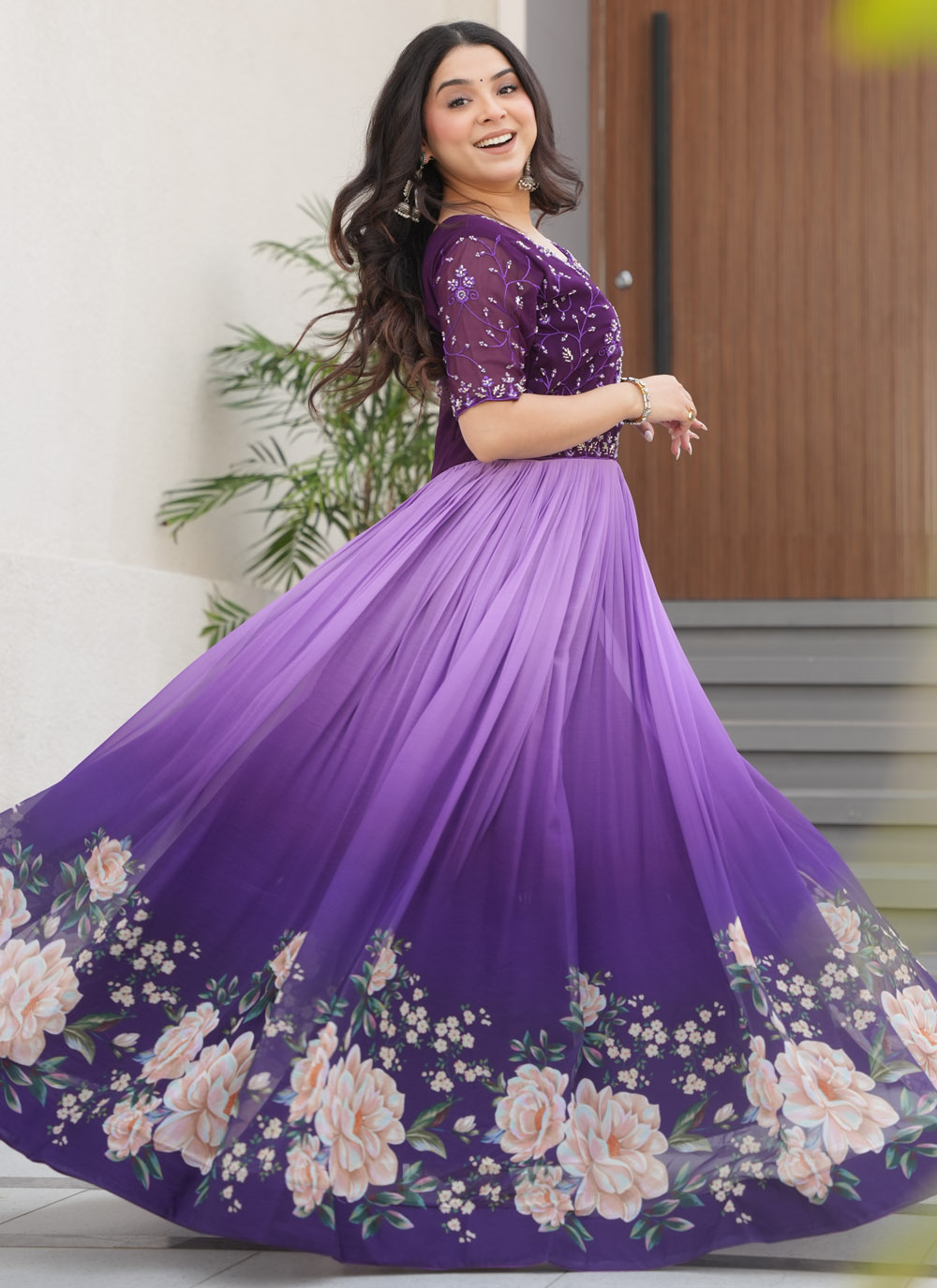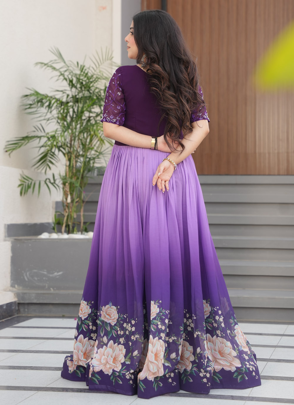 Let your style speak volumes in this modern faux georgette gown. The seamless blend of digital floral artistry and intricate bead embroidery brings a regal aura to this purple stunner, ideal for receptions or festive occasions.