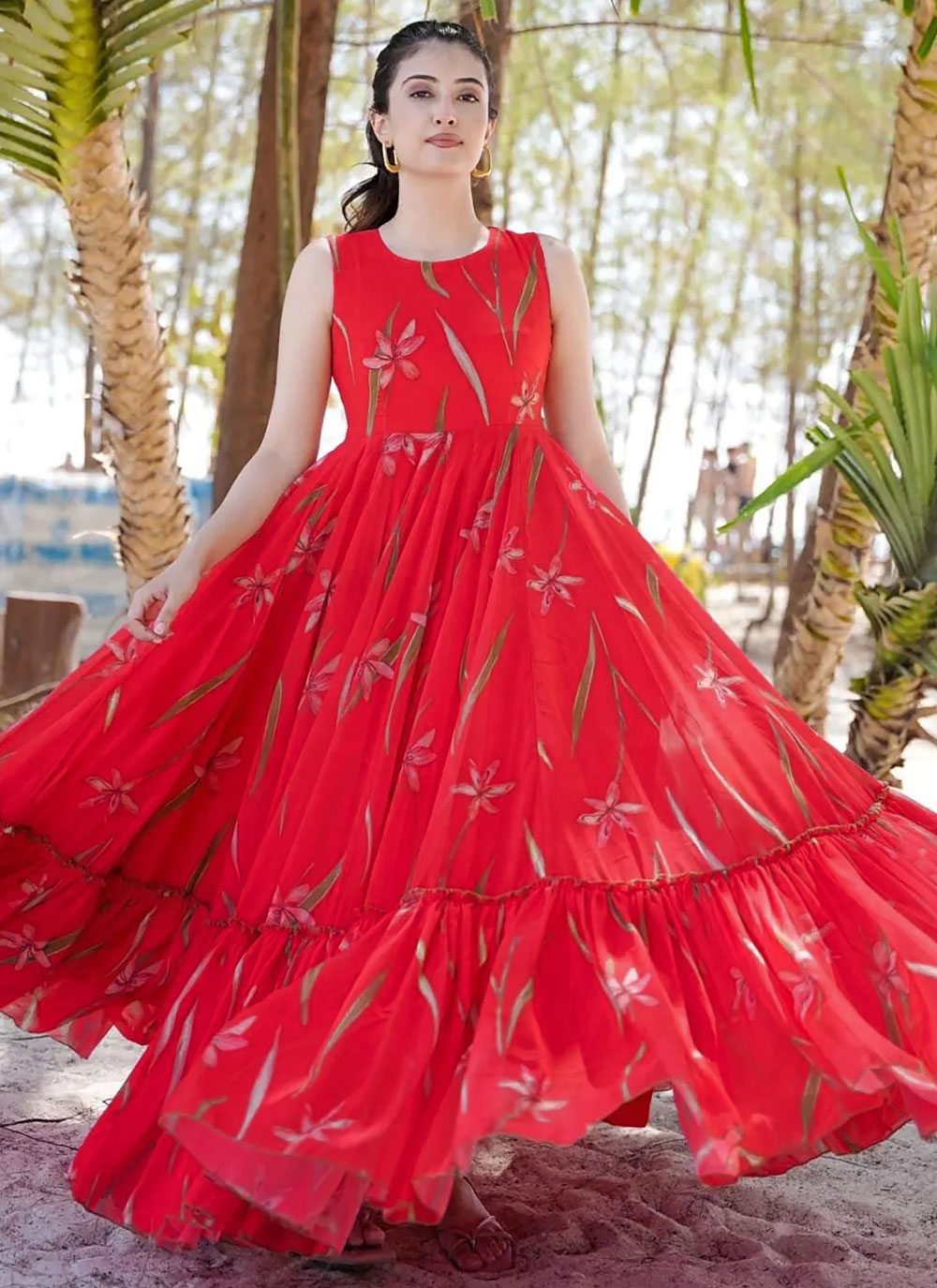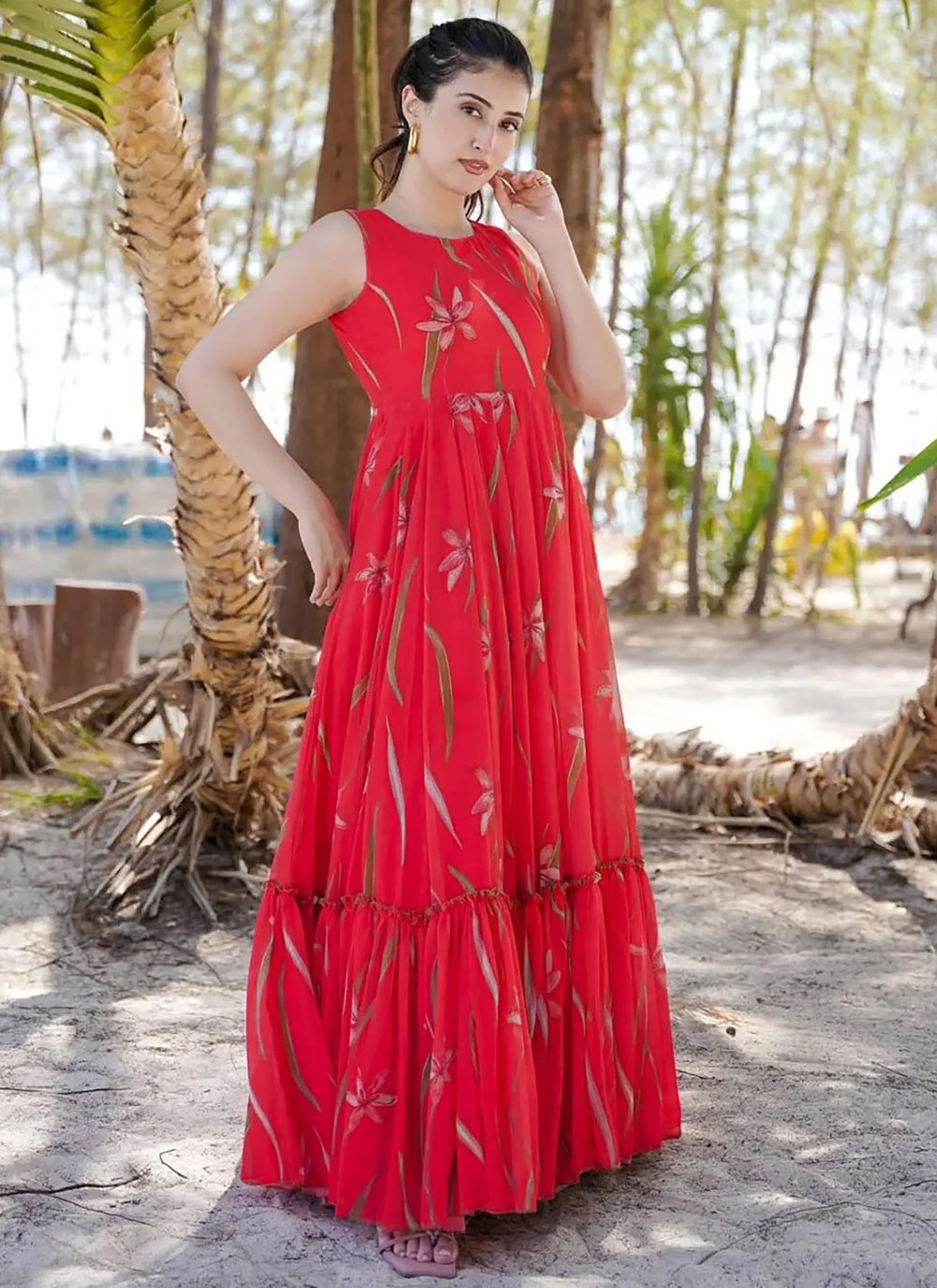 The Faux Georgette Digital Print Plus Size Readymade Gown in Red combines style and comfort. Featuring a vibrant digital print, this ready-to-wear gown offers a flattering fit and is perfect for special occasions, parties, and celebrations.