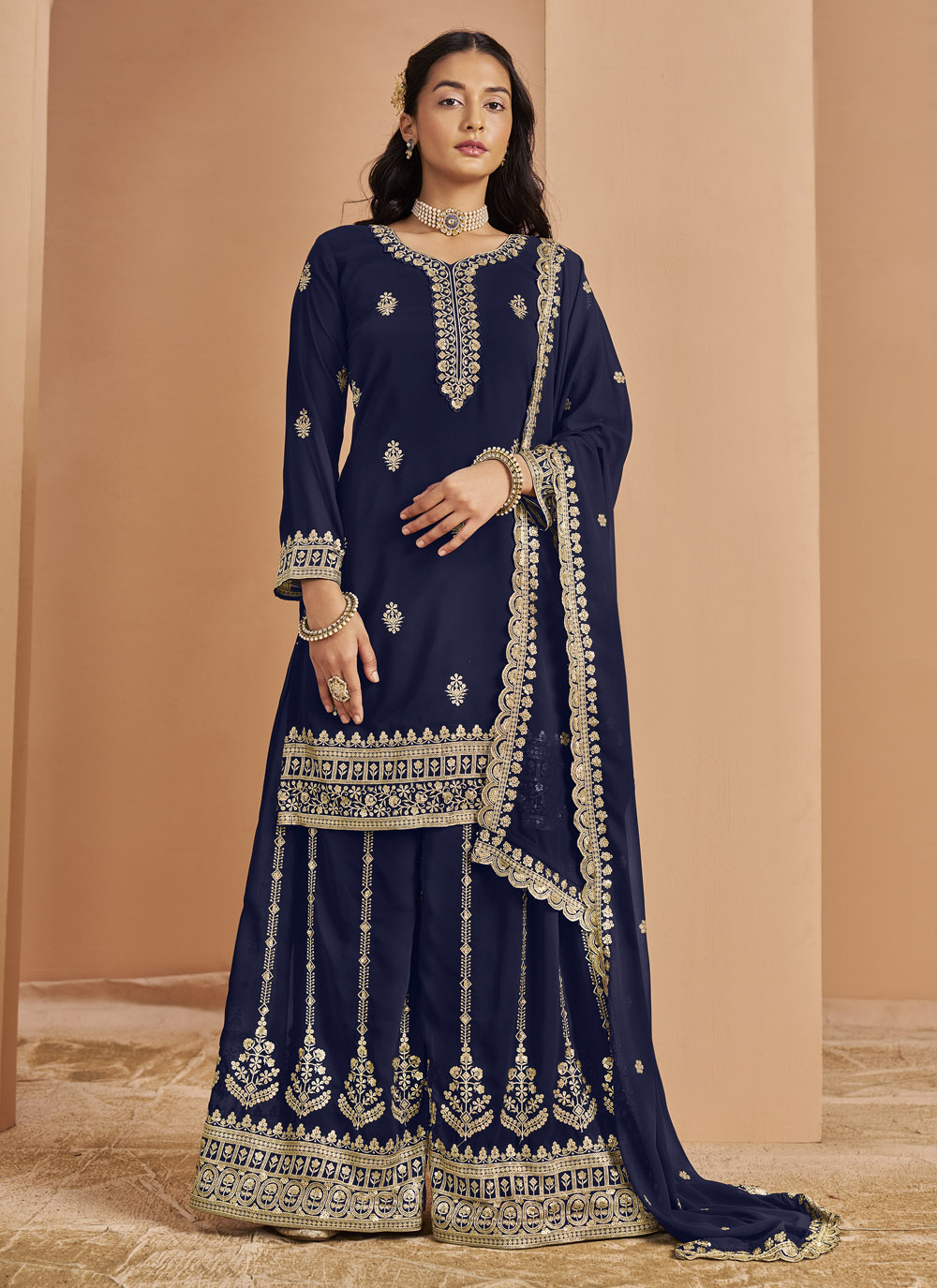 Make a refined style statement in this blue faux georgette salwar suit featuring detailed zari and sequins embroidery. The contemporary palazzo style pairs beautifully with traditional embellishments, offering a sophisticated look for receptions and celebrations. Comes with matching bottom and dupatta.