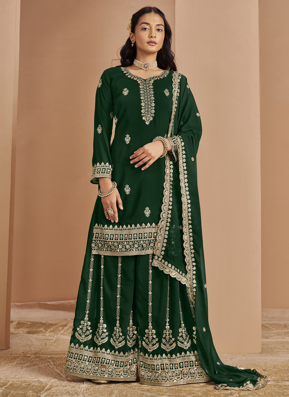 This graceful green salwar kameez features rich faux georgette fabric embellished with sparkling sequins and traditional zari work. Designed to flatter every silhouette, it’s a beautiful ensemble for cultural events, family gatherings and festive occasions. Comes with matching bottom and dupatta.