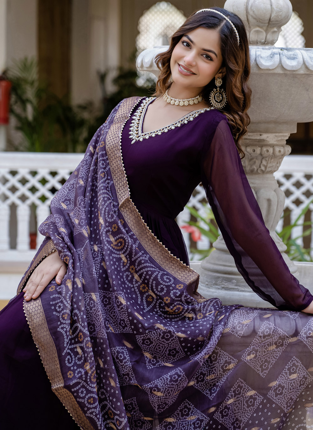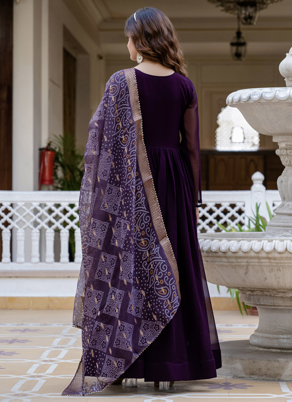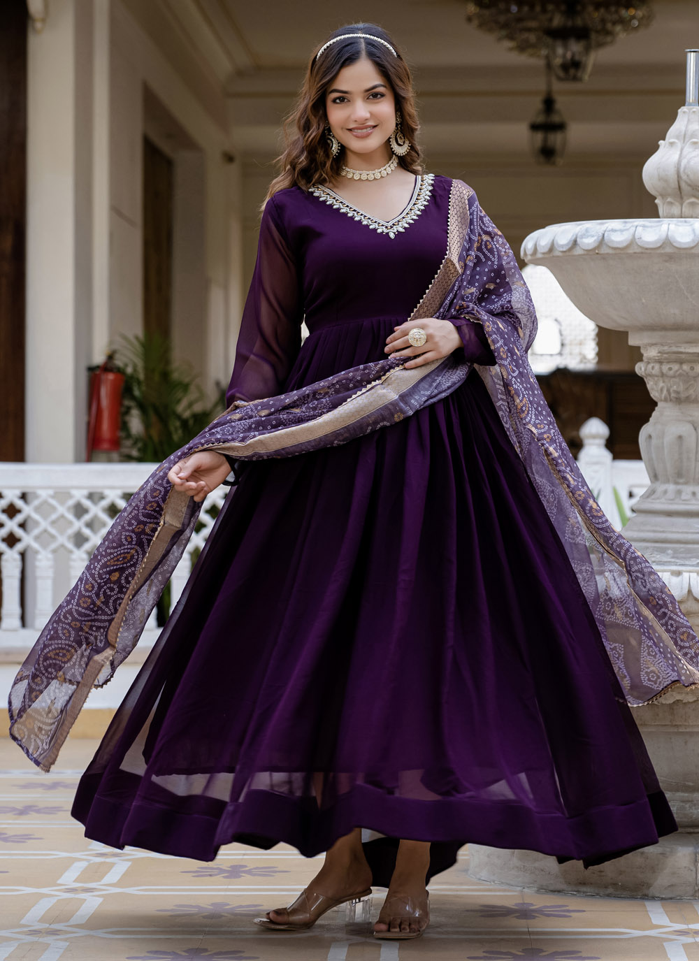 Grace the occasion in this wine-colored faux georgette gown with exquisite handwork detailing. Its rich tone and trendy silhouette make it a perfect pick for evening events and festive celebrations. Designed for women who love style with a touch of tradition. Comes with matching dupatta.