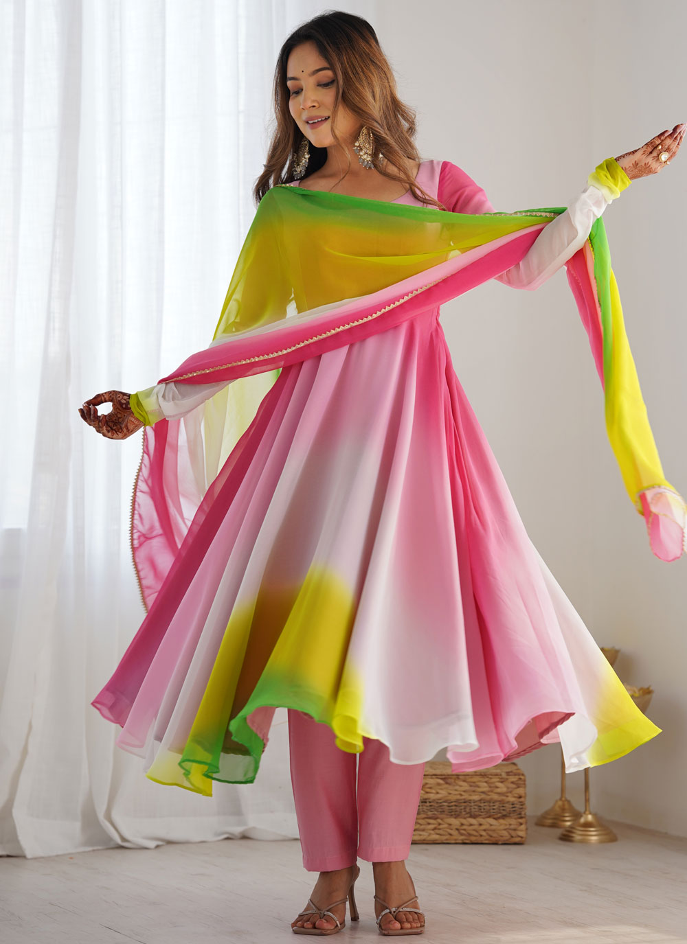 The Faux Georgette Multi-Colour Readymade Salwar Kameez includes a salwar kameez, bottom, and dupatta. Made from lightweight faux georgette, this vibrant, multi-color set offers comfort and style for any occasion.