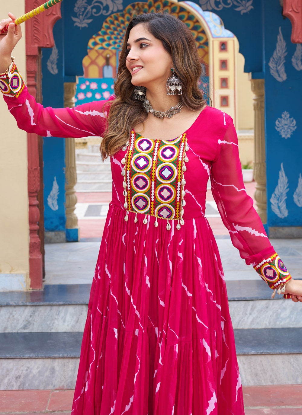 This pink faux georgette gown brings together graceful charm and modern appeal. Featuring beautiful patch work detailing, it radiates understated glamour. The flowy fabric drapes beautifully, offering a flattering fit that’s perfect for weddings, receptions or festive functions.