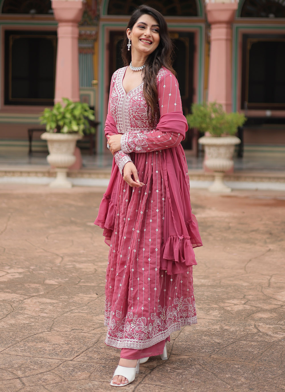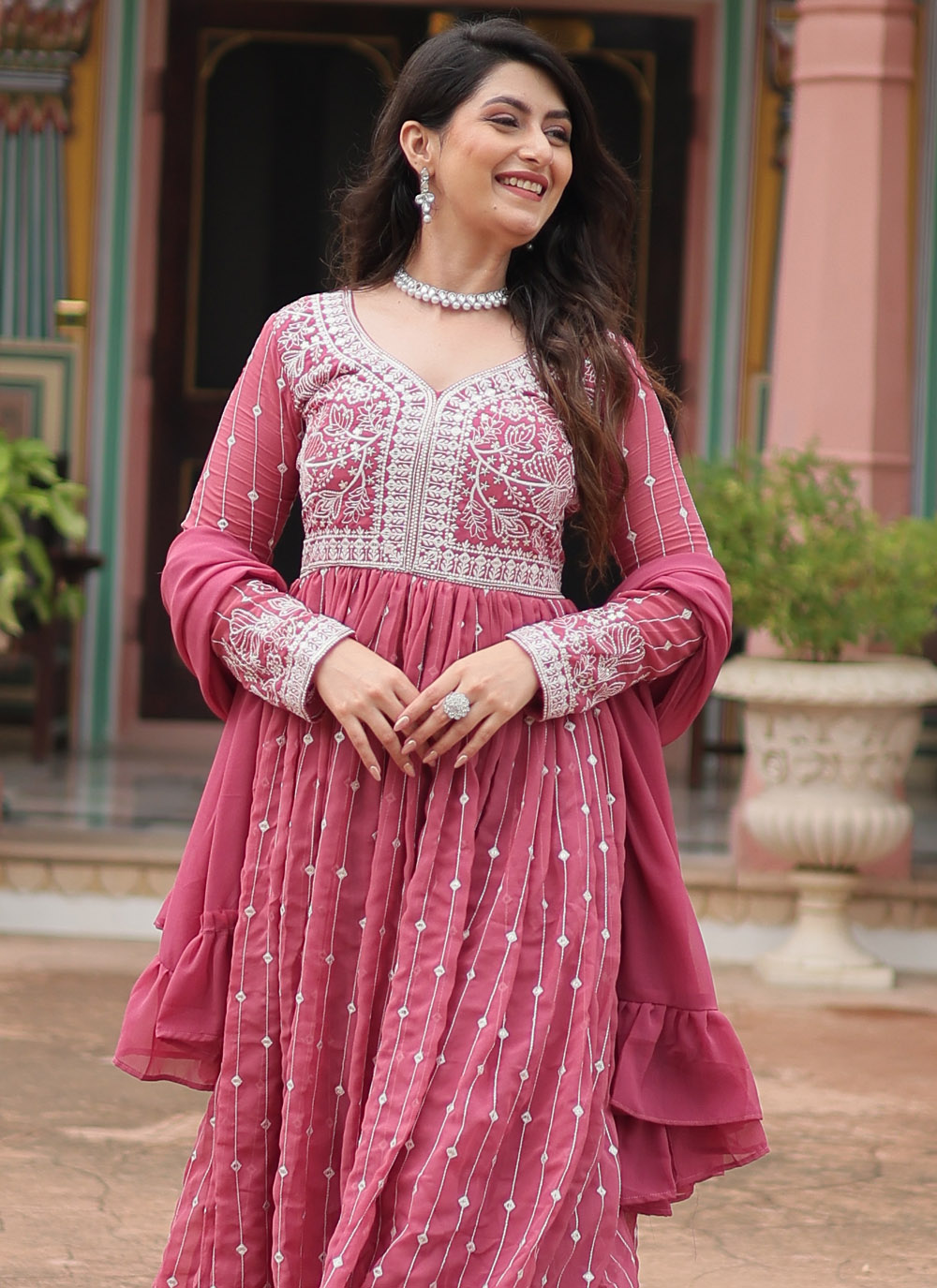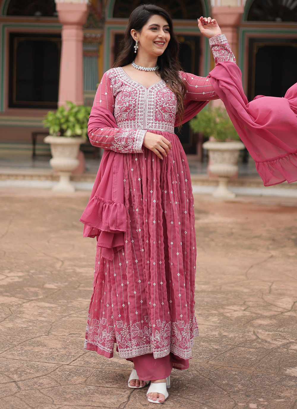 Add elegance to your ethnic collection with this peach faux georgette salwar suit featuring delicate sequins and thread embroidery. Its soft shade and refined detailing create a stylish look ideal for festive wear. Comes with matching bottom and dupatta.