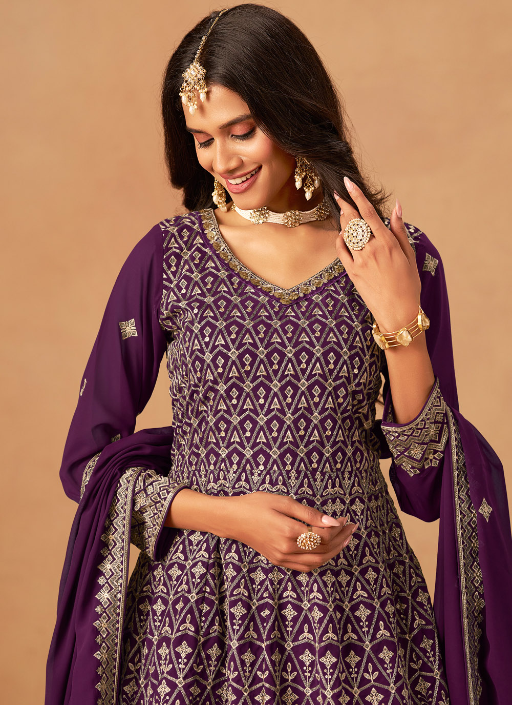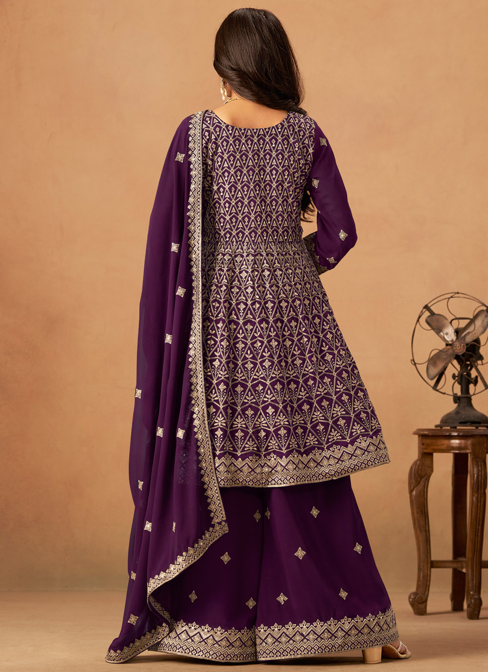 This Embroidered Palazzo Salwar Suit in faux georgette showcases purple thread and sequins detailing, combining comfort with a designer look that is perfect for festive ceremonies. Comes with matching bottom and dupatta.