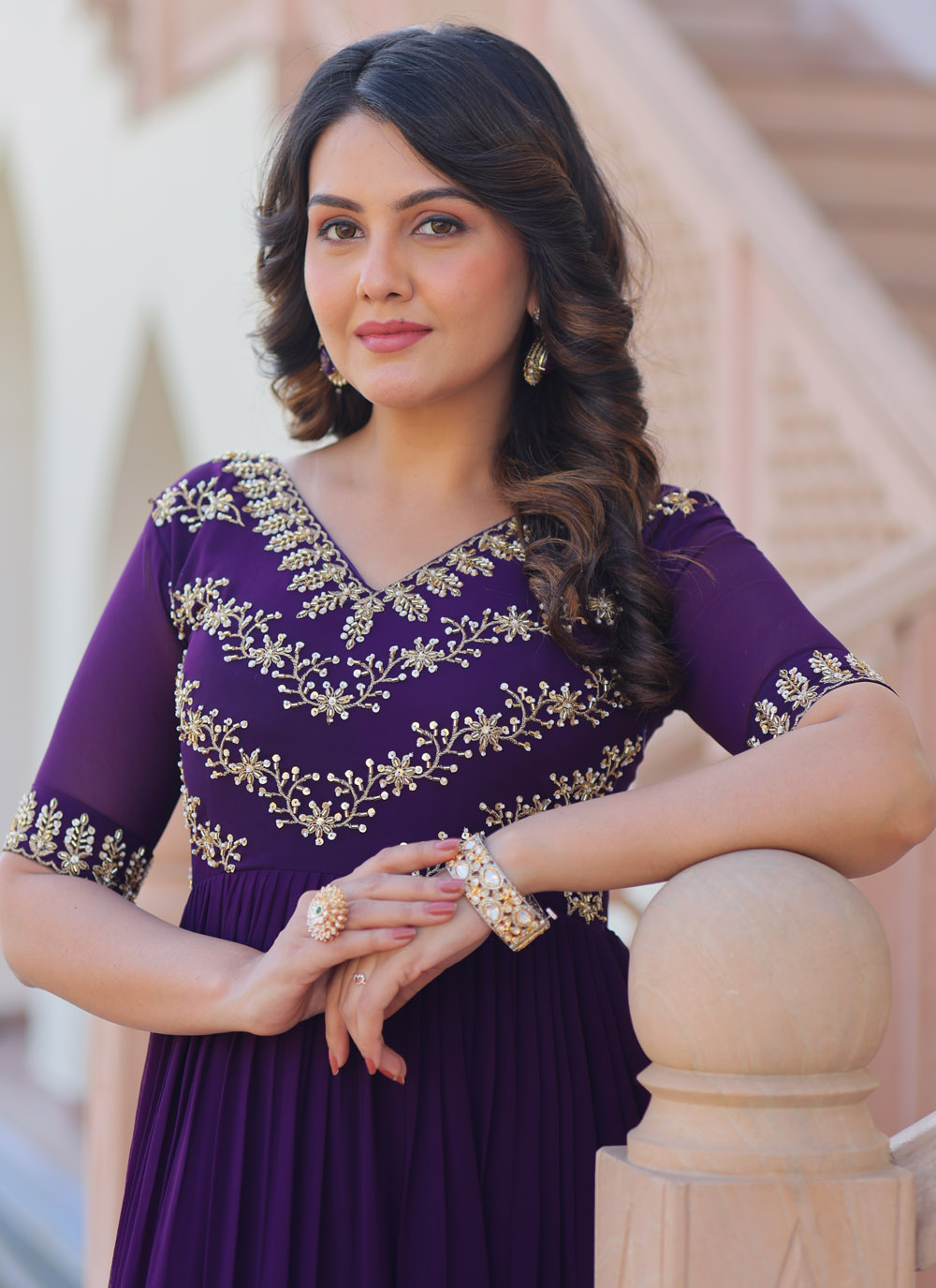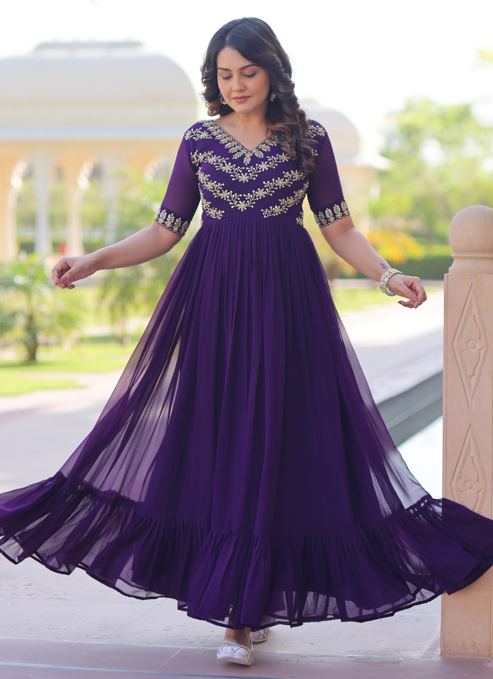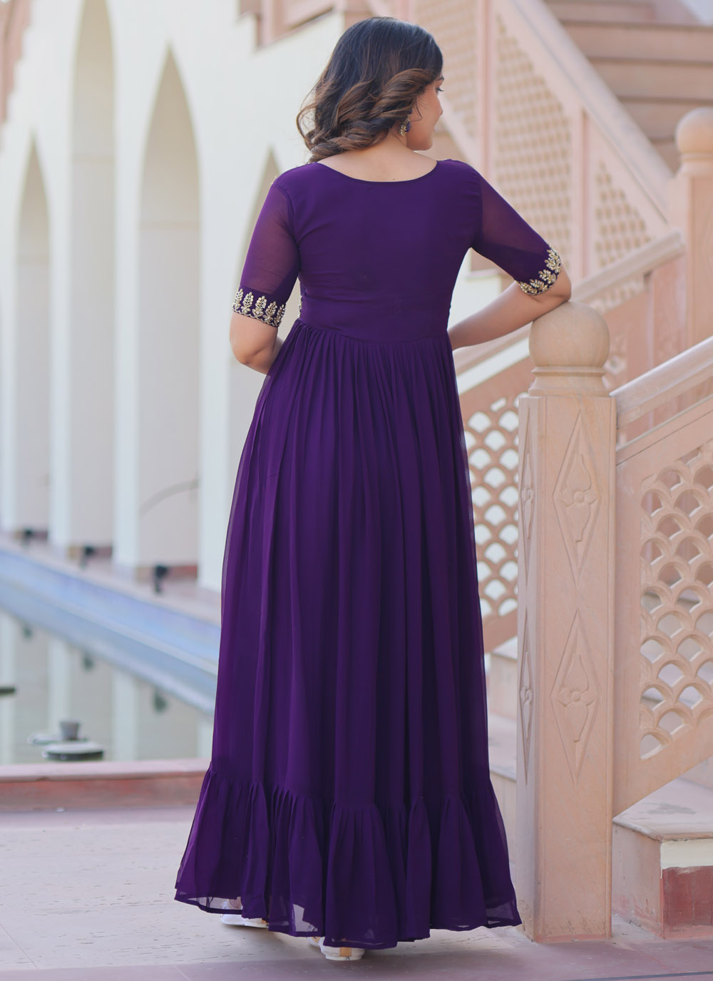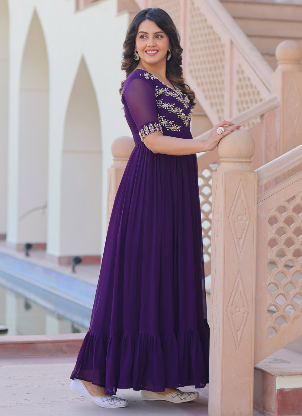 Drape yourself in refined glamour with this purple embroidered gown, designed in flowy faux georgette and adorned with dazzling sequins, beads and multithread embroidery. The floor-length silhouette adds grace, while the embellishments bring out festive sparkle.