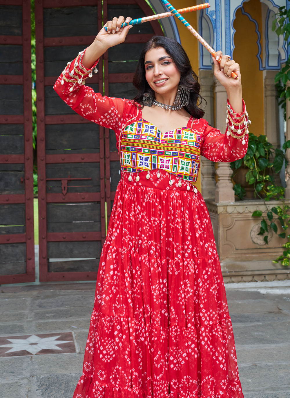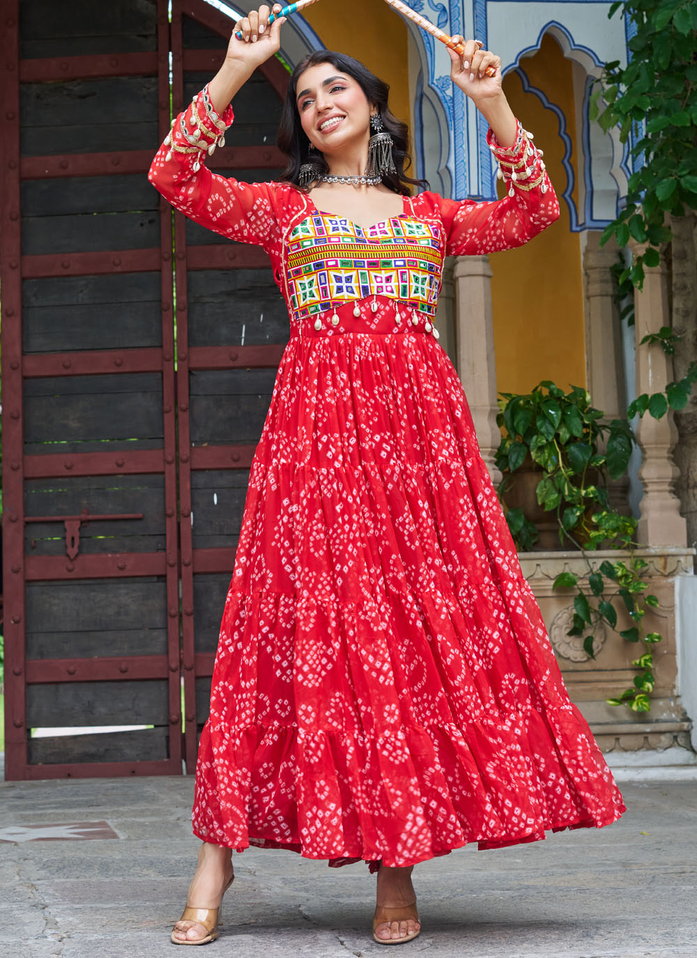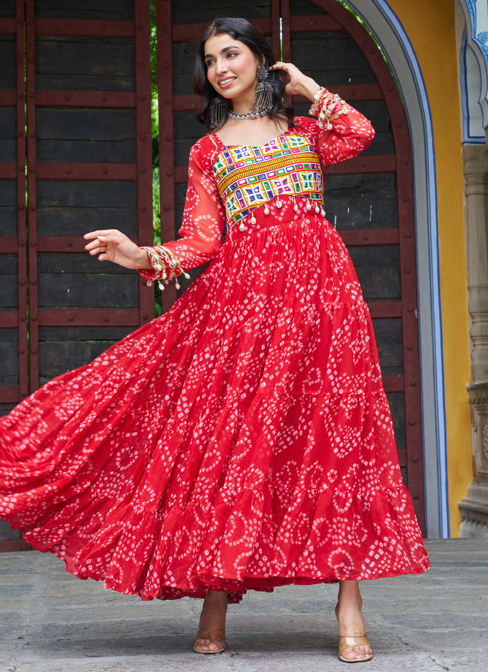 Celebrate your roots with modern style in this Red Printed Gown, featuring signature Gamthi-inspired patchwork on breathable faux georgette. Ready-to-wear, lightweight, and eye-catching—this gown is perfect for festive occasions.