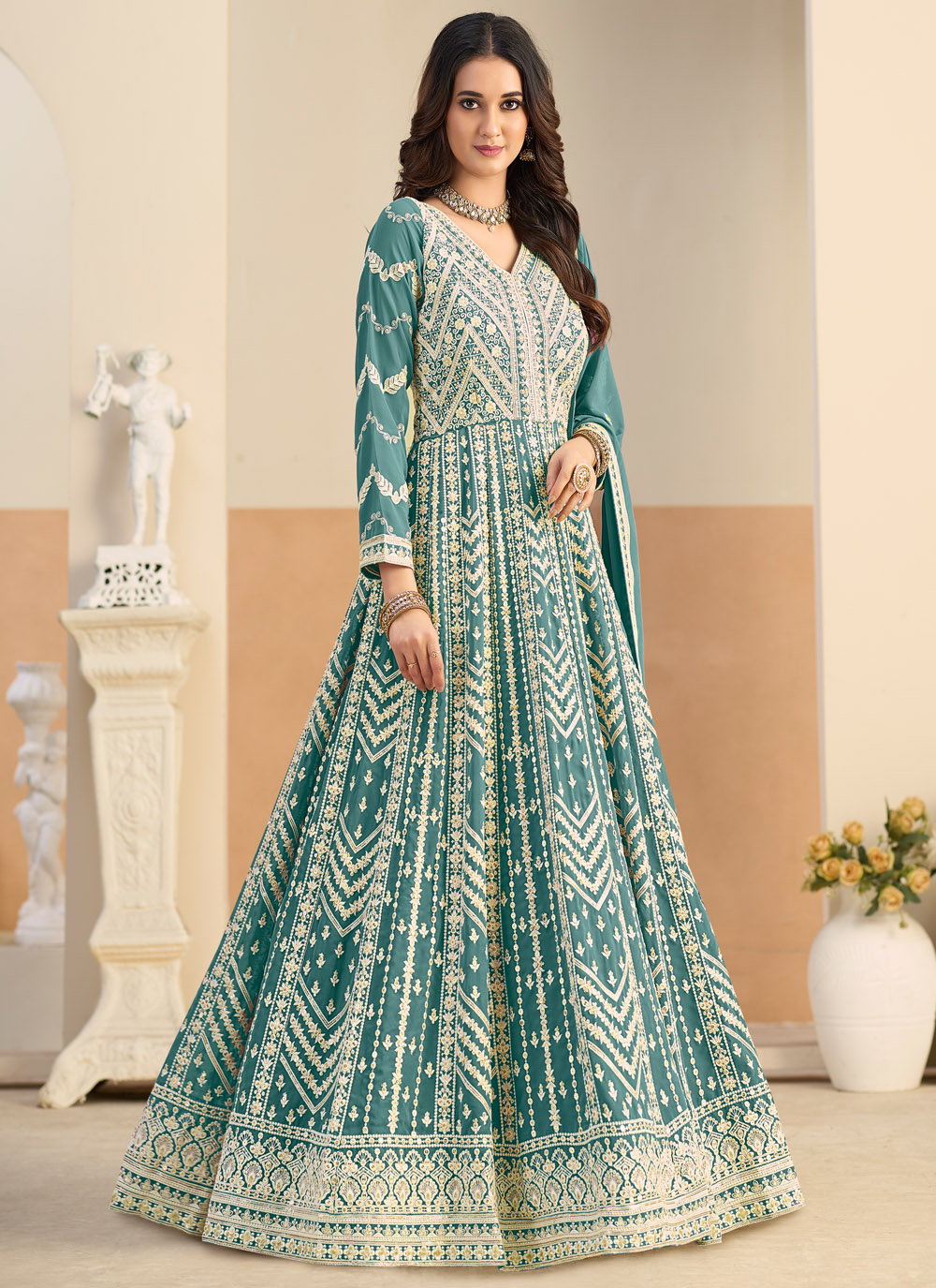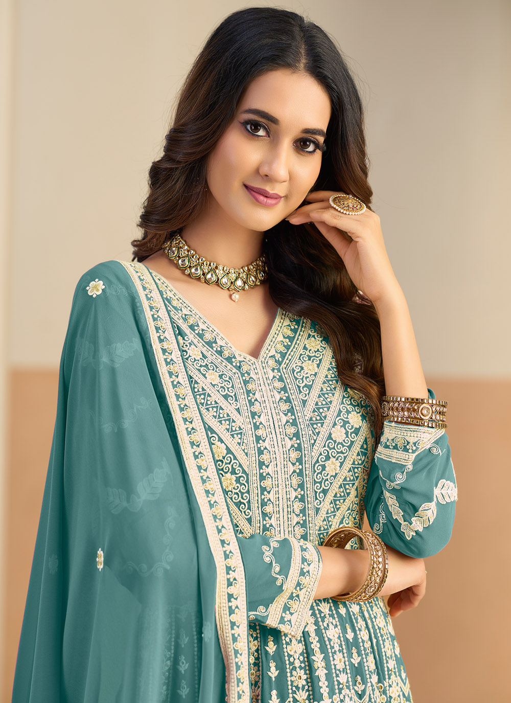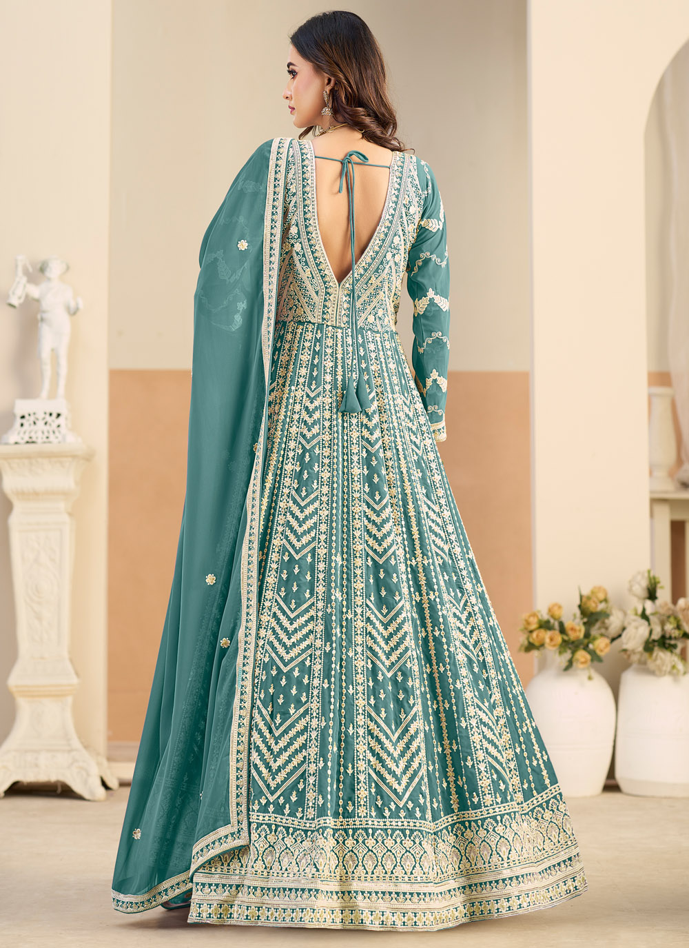 This sea green embroidered Anarkali salwar kameez is designed for women who appreciate graceful style with modern comfort. The lightweight faux georgette fabric drapes effortlessly, creating an elegant silhouette. Comes with matching choli and dupatta.