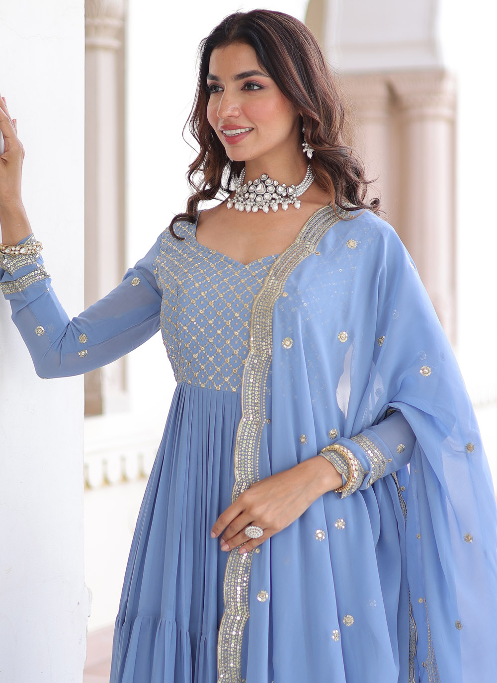 This aqua blue readymade gown in faux georgette stands out with its delicate sequin embroidery that adds a lovely sparkle. Its soft, flowy fabric ensures a graceful look for festive gatherings and evening events. Comes with matching dupatta.
